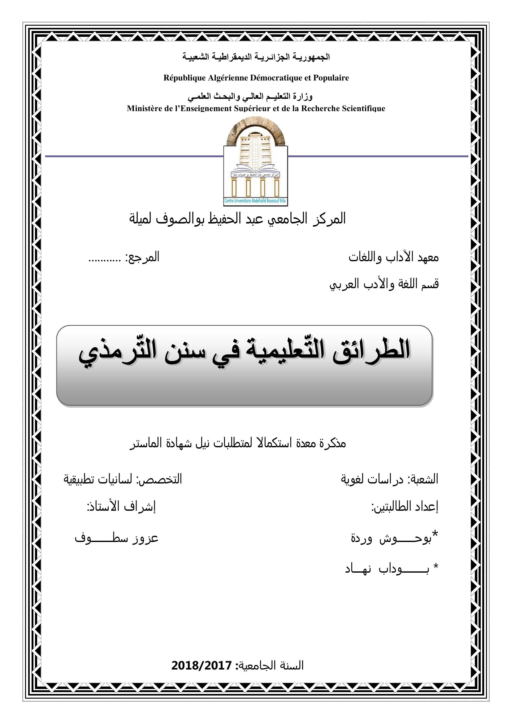 بوحوش وردة & سطوف عزوز (مشرفا) (2018). الطرائق التعليمية في سن الترميذي.