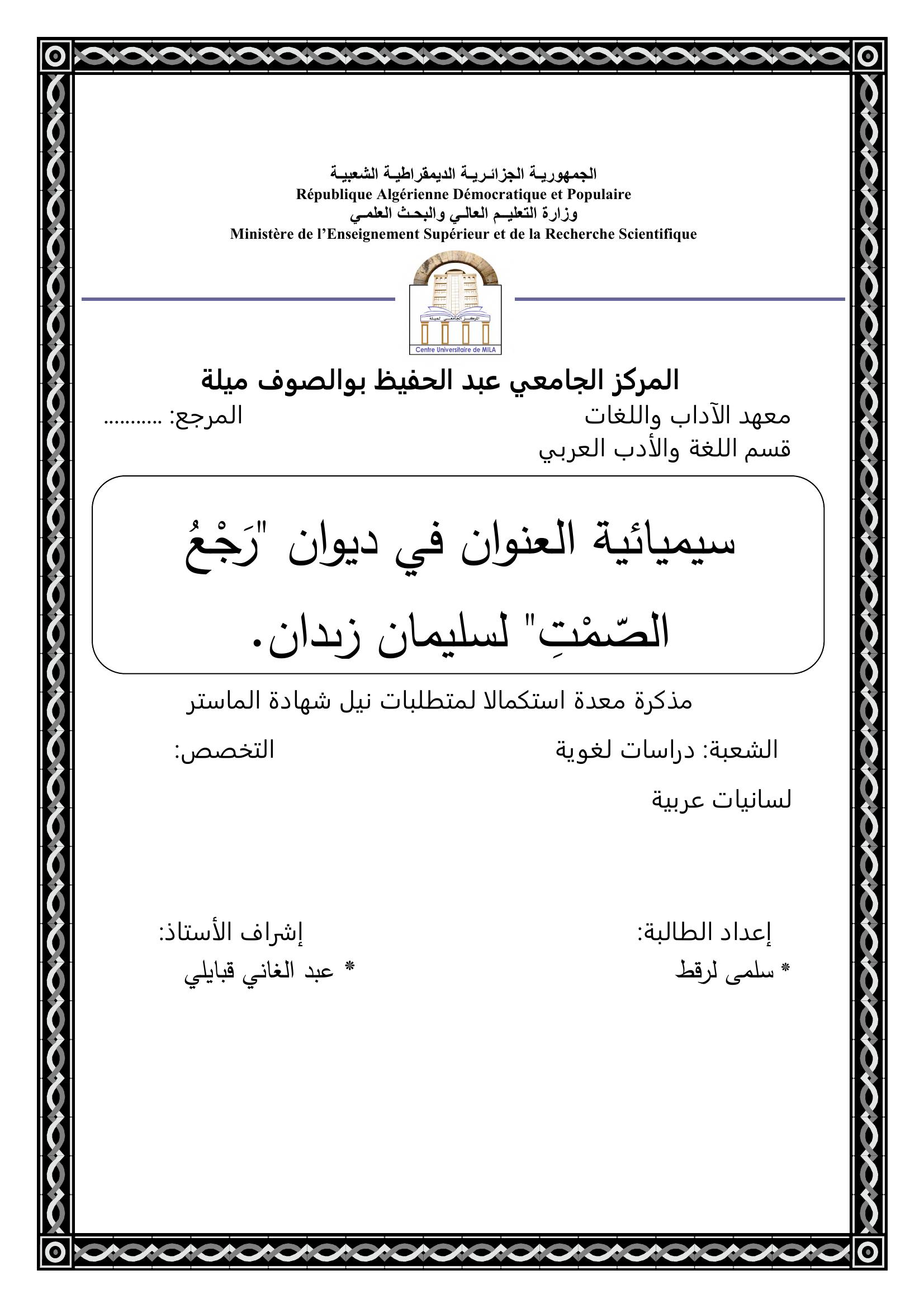 لرقط سلمى & قبايلي عبد الغاني (مشرفا) (2018). سيميائية العنوان في ديوان رجع الصمت لسليمان زيدان.