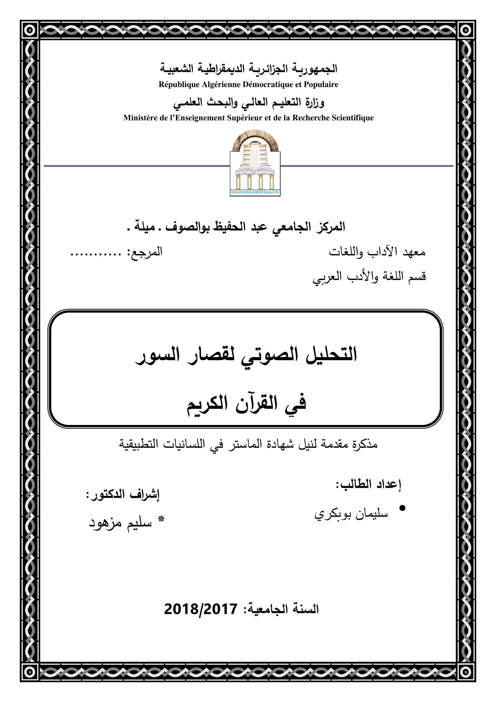 بوبكري سليمان & مزهود سليم (مشرفا) (2018). التحليل الصوتي لقصار السور في القرآن الكريم.