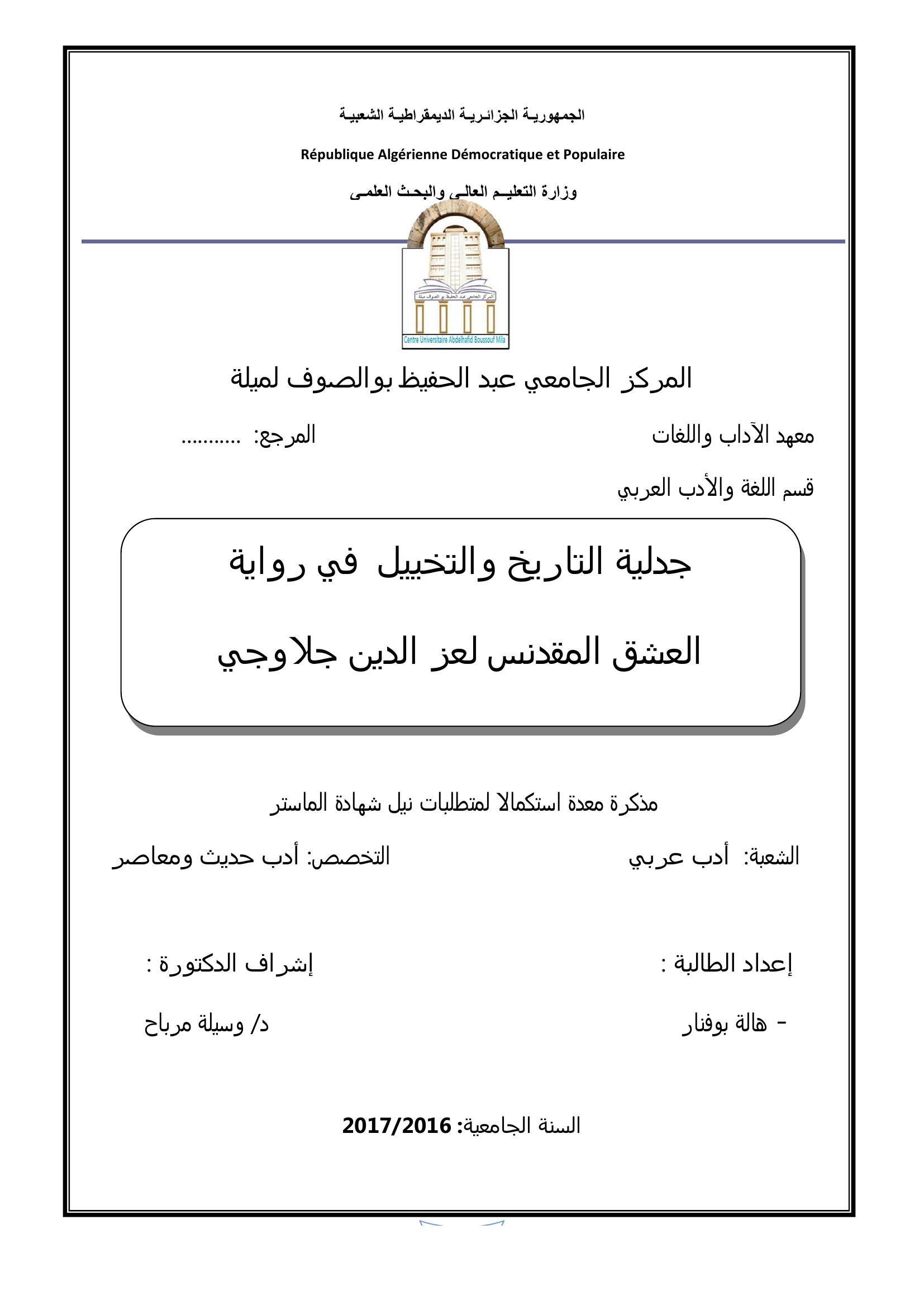 بوفنار هالة & مرباح وسيلة (مشرفا) (2018). جدلية التاريخ والتخييل في رواية العشق المقدنس لعز الدين جلاوجي.