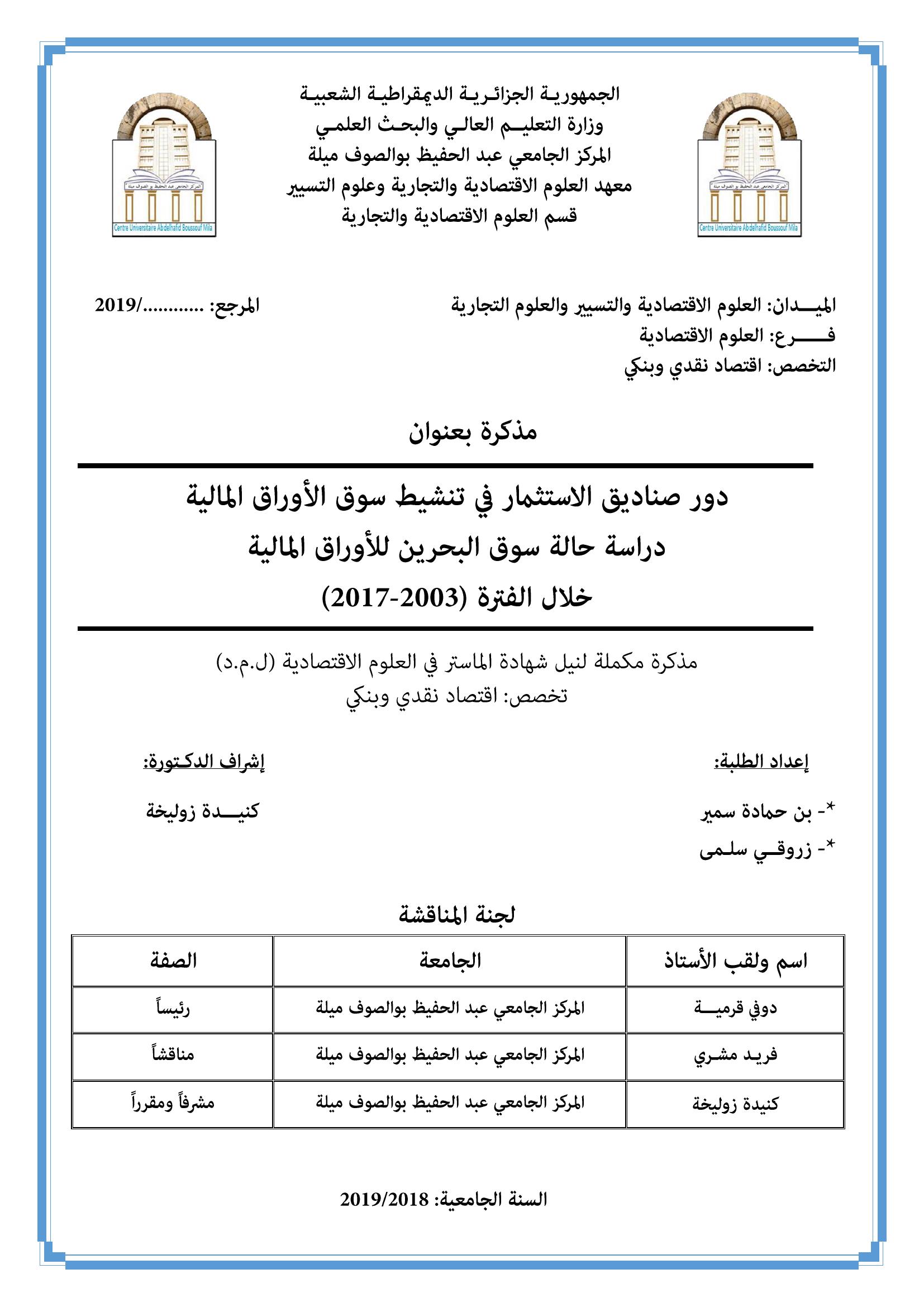 بن حمادة سمير & دوفي قرمية (رئيسا)،مشري فريد (مناقشا)، كنيدة زوليخة (مشرفا ومقررا) (2019). دور صناديق الإستثمار في تنشيط سوق الأوراق المالية دراسة حالة سوق البحرين للأوراق المالية خلال الفترة (2003-2017).