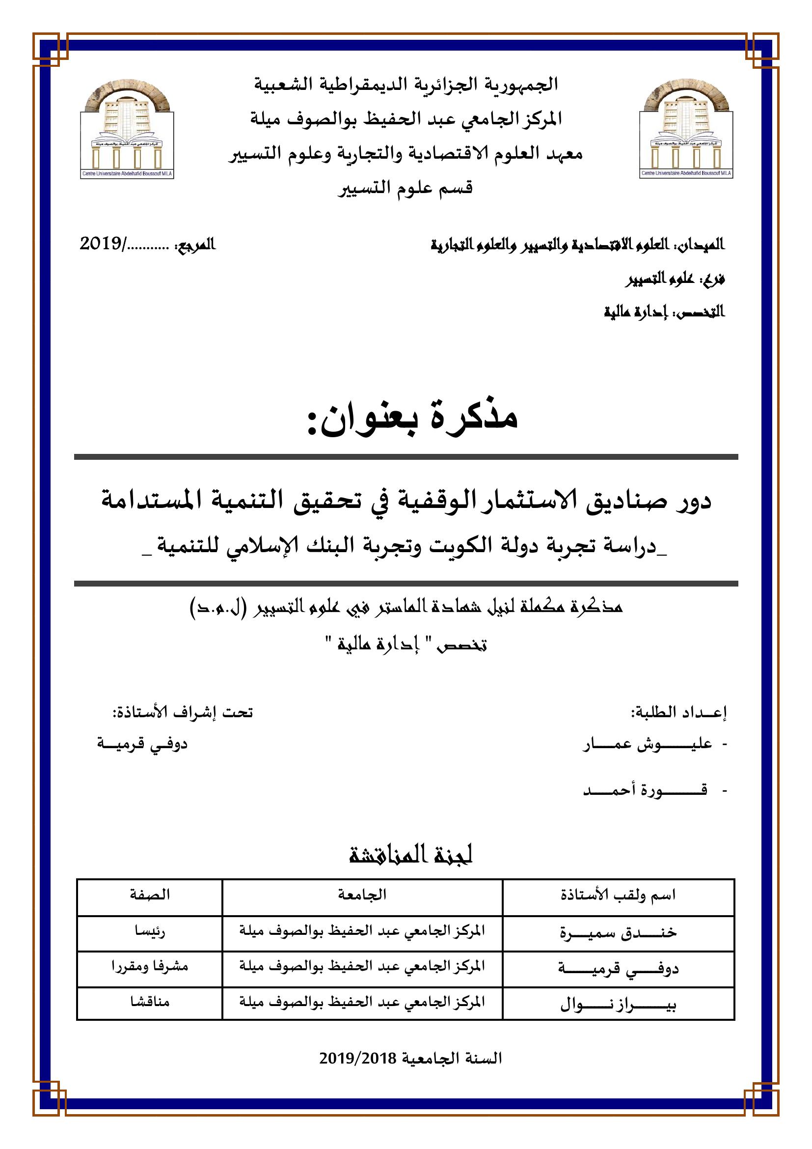 عليوش عمار & خندق سميرة(رئيسا)، دوفي قرمية (مشرفا ومقررا)، بيراز نوال (مناقشا)، (2019). دور صناديق الإستثمار الوقفية في تحقيق التنمية المستدامة دراسة تجربة الكويت وتجربة البنك الإسلامي للتنمية.