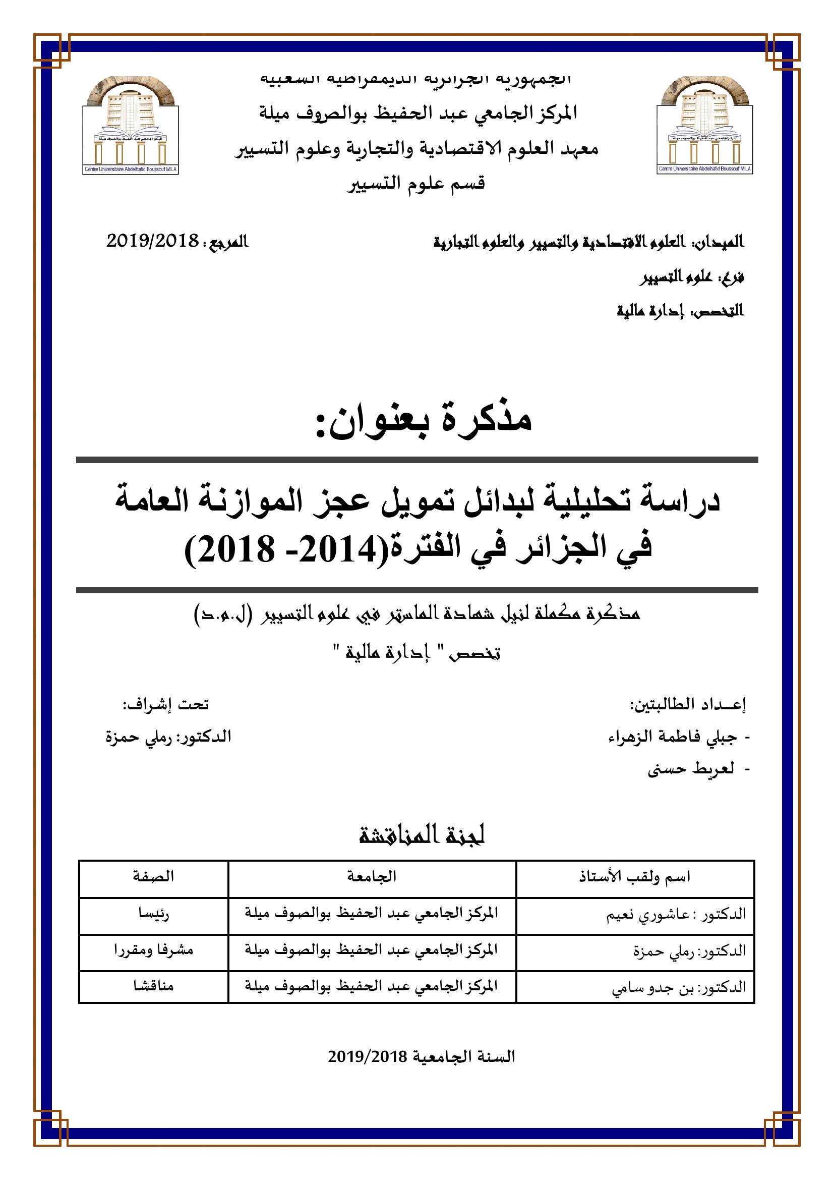 جبلي فاطمة الزهراء & رملي حمزة(مشرفا) (2019). دراسة تحليلية لبدائل تمويل عجز الموازنة العامة في الجزائر في الفترة (2014-2018).