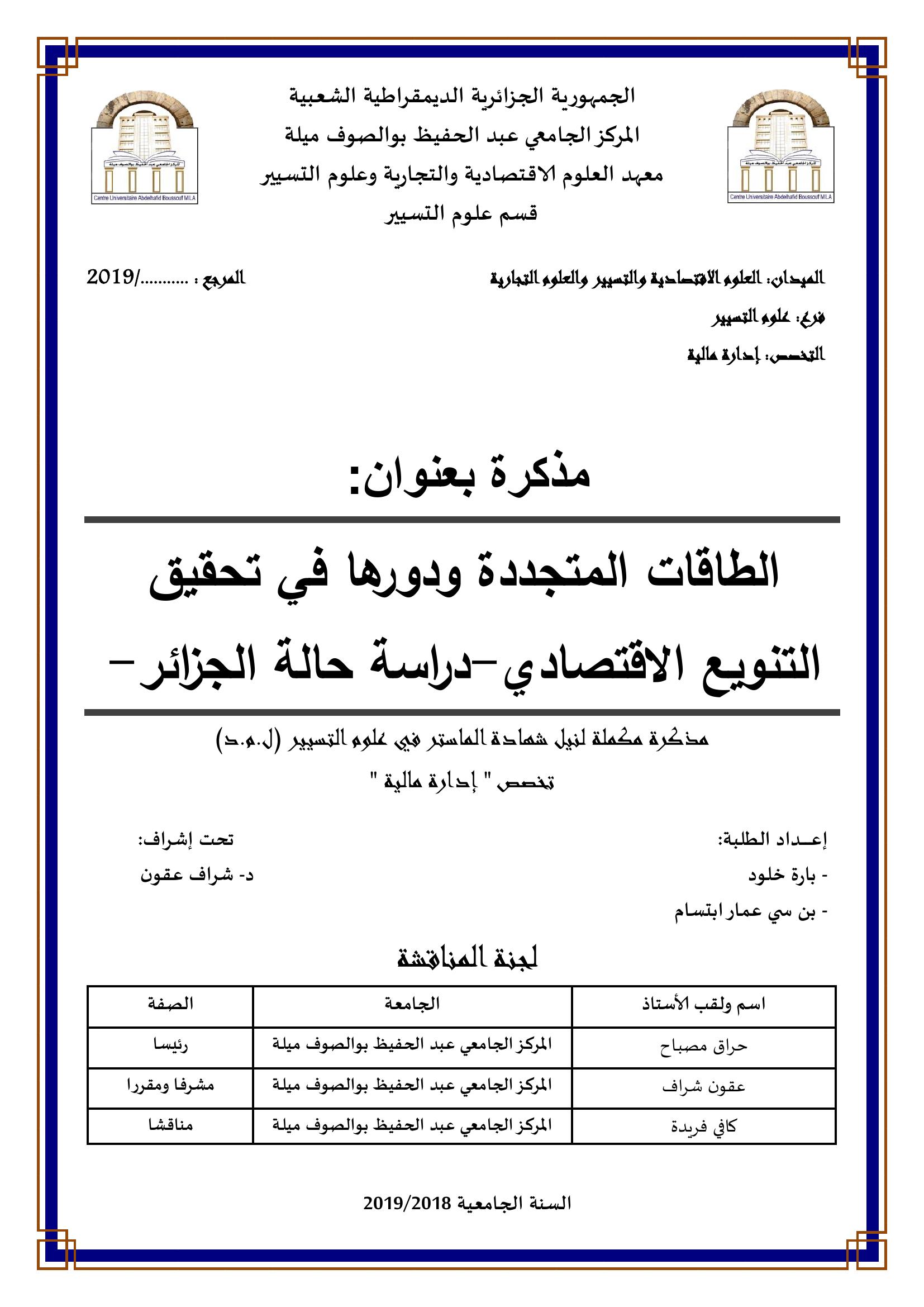 بارة خلود & حراق مصباح (رئيسا) ، عقون شراف (مشرفا ومقررا)،كافي فريدة (مناقشا) (2019). الطاقات المتجددة ودورها في تحقيق التنويع الاقتصادي د اراسة حالة الجزائر.