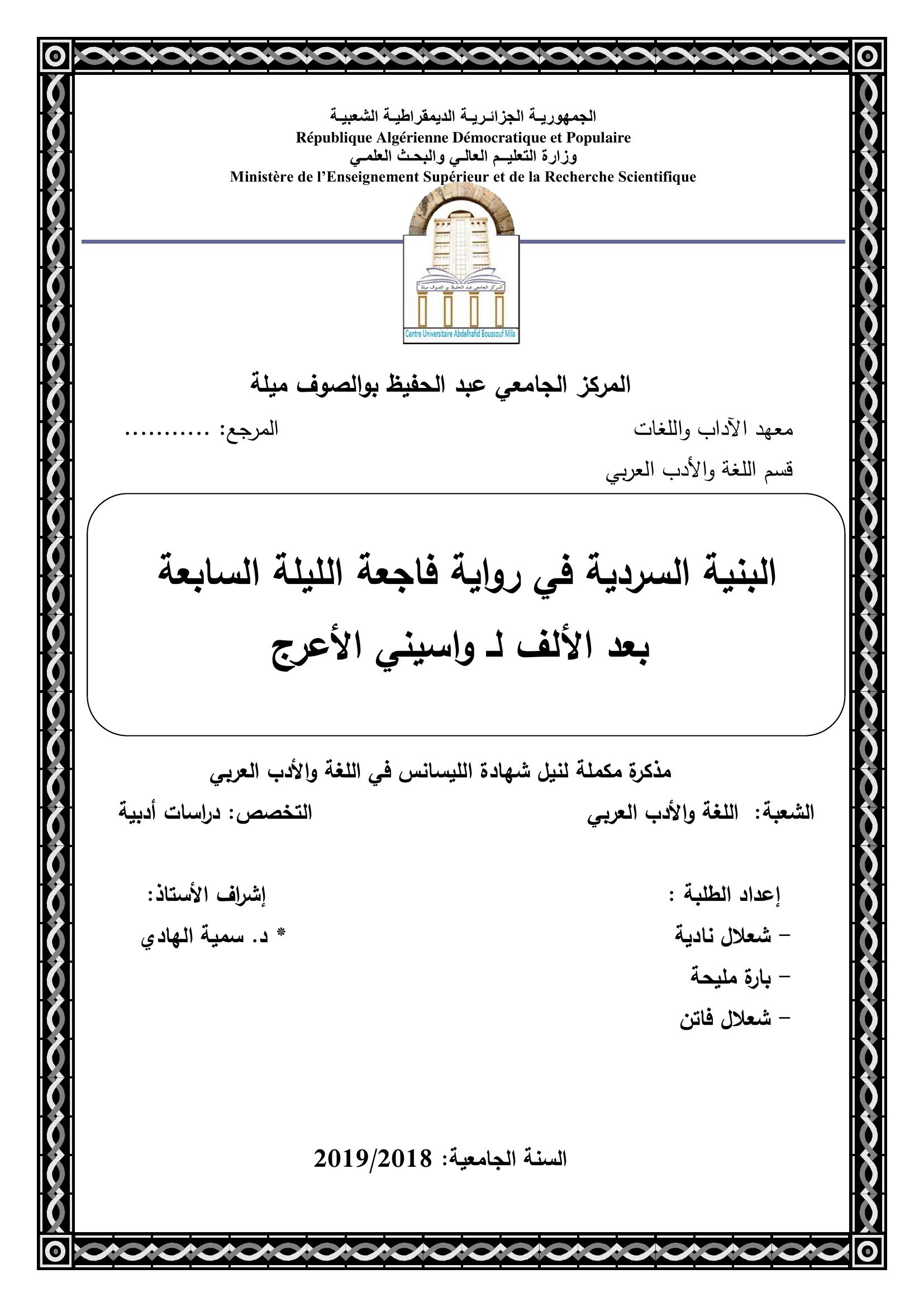 شعلال نادية & الهادي سمية (مشرفا) (2019). البنية السردية في رواية فاجعة الميمة السابعة بعد الألف. ل. واسيني الأعرج.