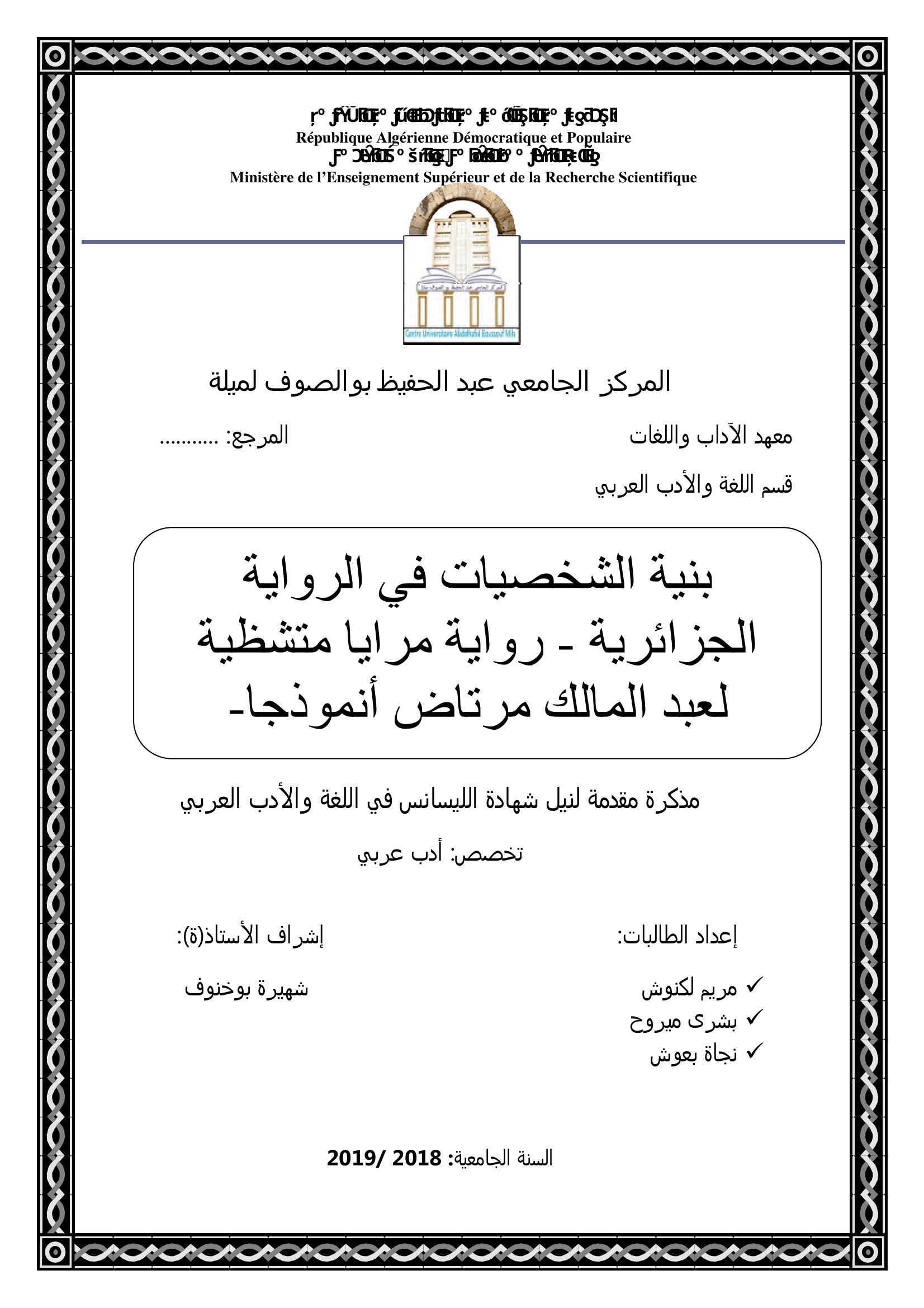 لكنوش مريم & بوخنوف شهيرة (مشرفا) (2019). بنية الشخصيات في الرواية الجزائرية -رواية مرايا متشظية -لعبد المالك مرتاض أنمودجا.