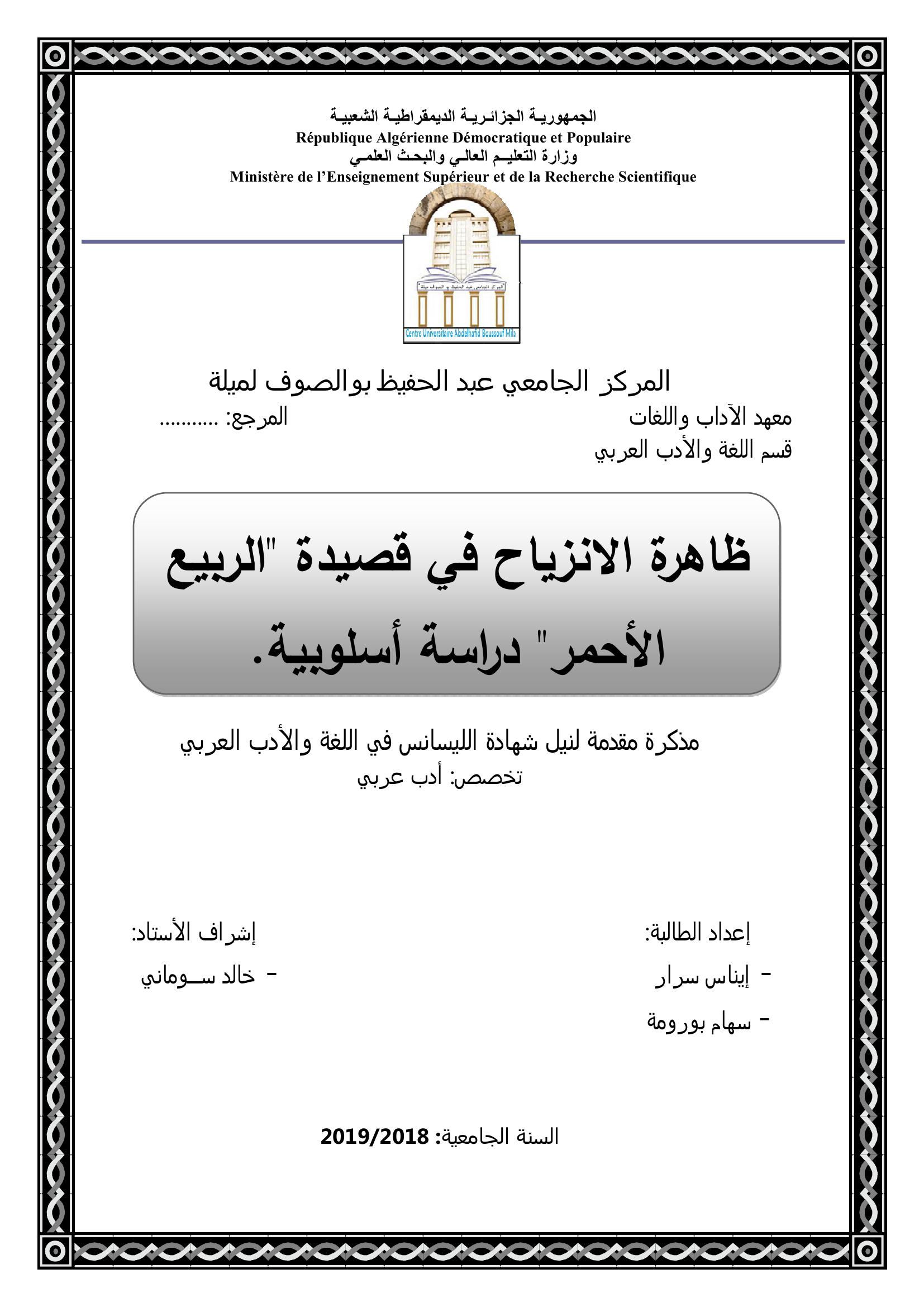 سرار ايناس & سونامي خالد (مشرفا) (2019). ظاهرة الانزياح في" قصيدة الربيع الاحمر" - دراسة أسلوبية-.