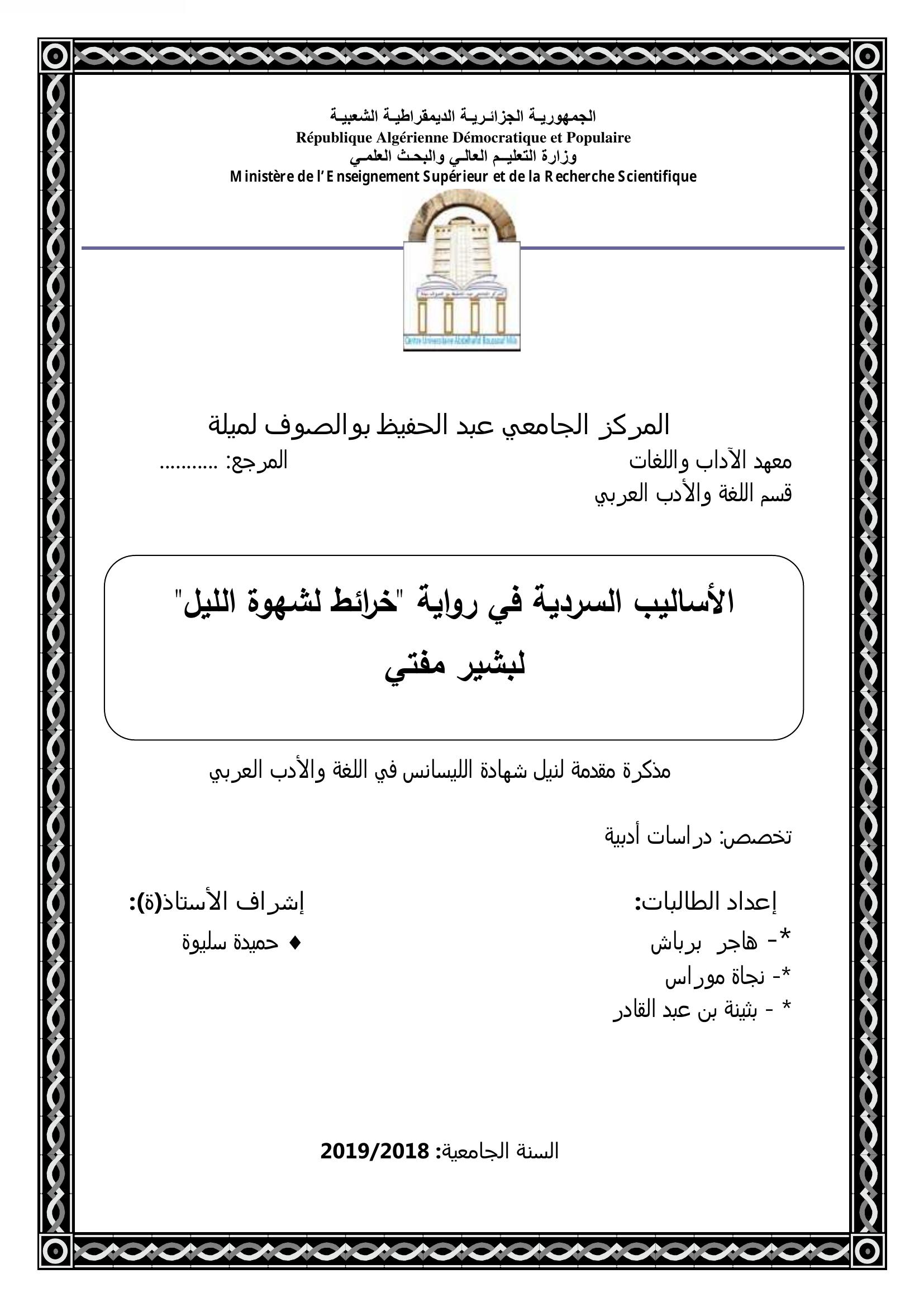 برباش هاجر & سليوة حميدة(مشرفا) (2019). الأساليب السردية في رواية "خرائط لشهوة الليل"لبشيؤ مفتي.