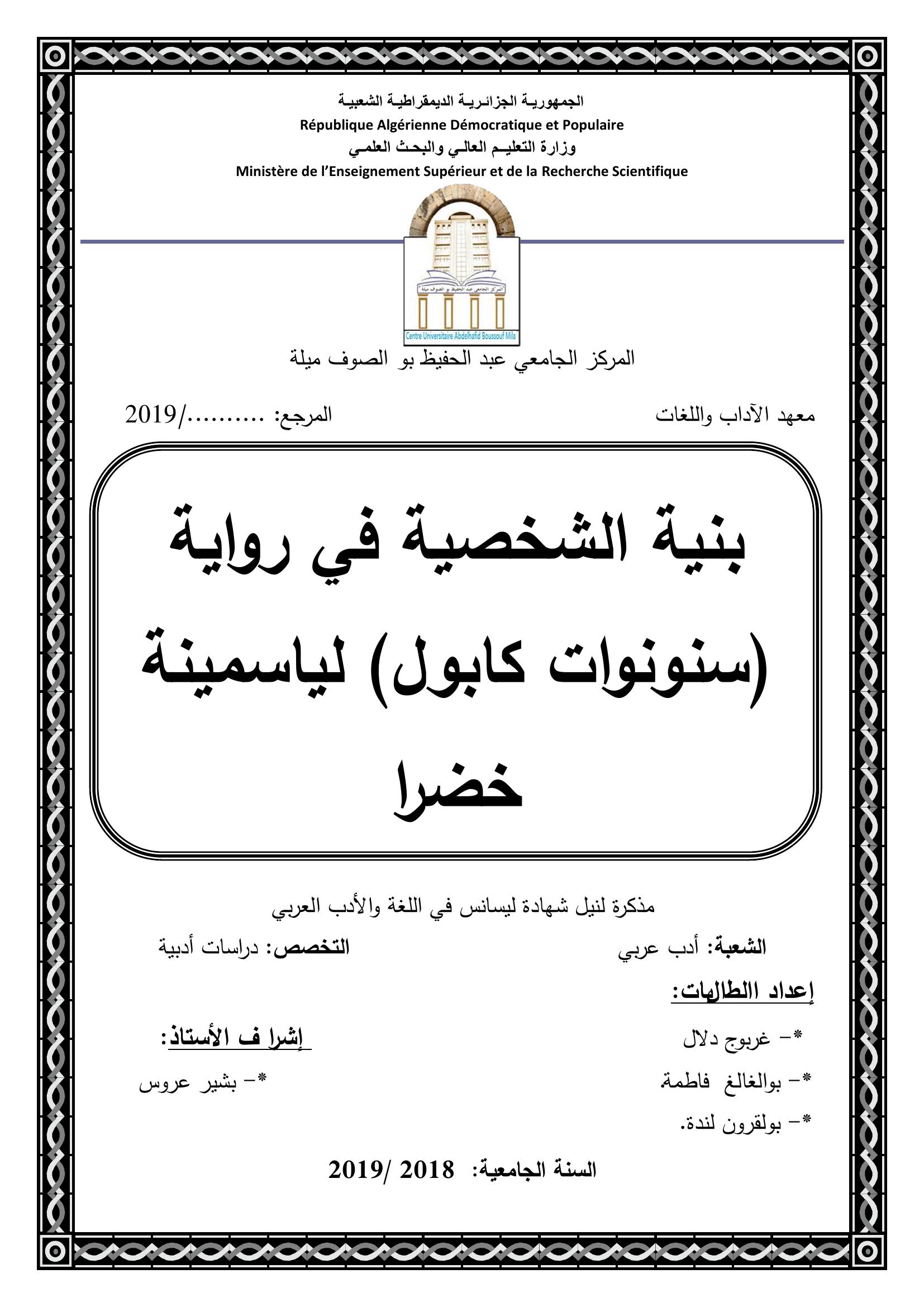 غربوج دلال & عروس بشير(مشرفا) (2019). بنية الشخصية في رواية "سنونوات كابول " لياسمينة خضرا.