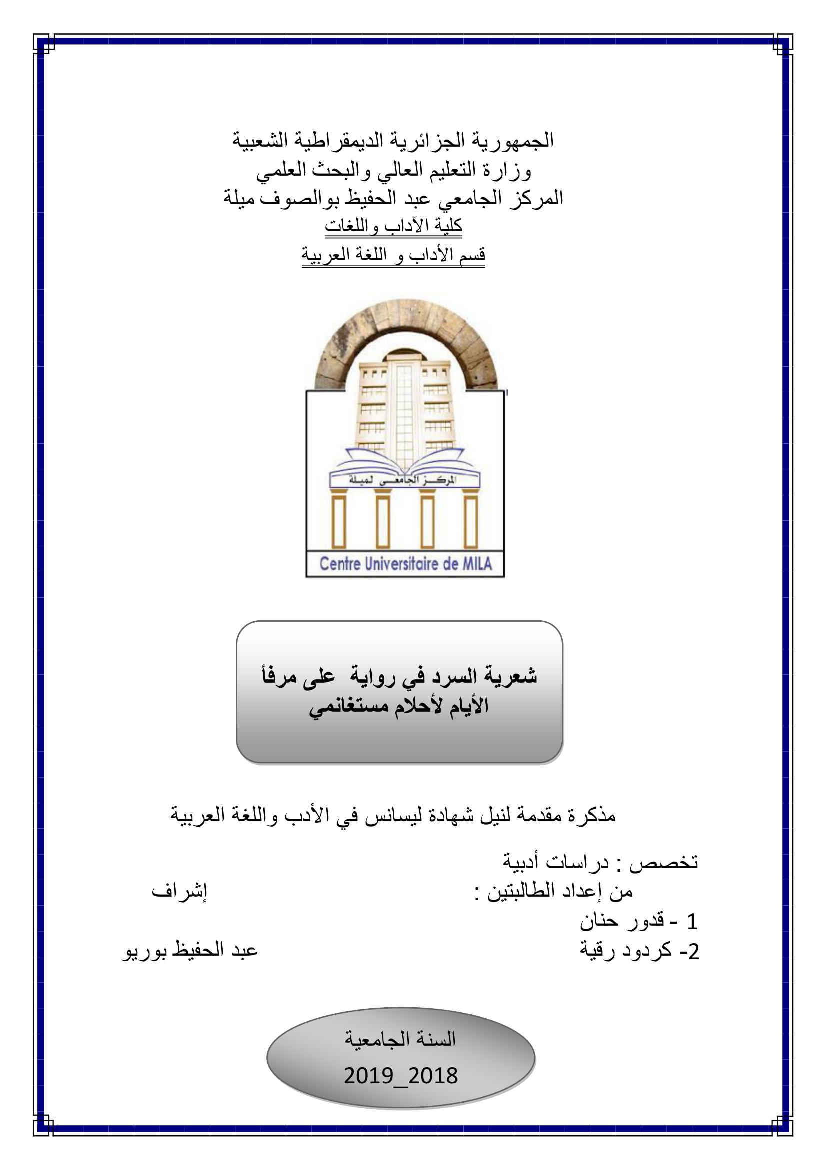 قدور حنان & بوريو عبد الحفيظ (مشرفا) (2019). شعرية السرد في رواية على مرفأ الأيام لأحلام مستغانمي.