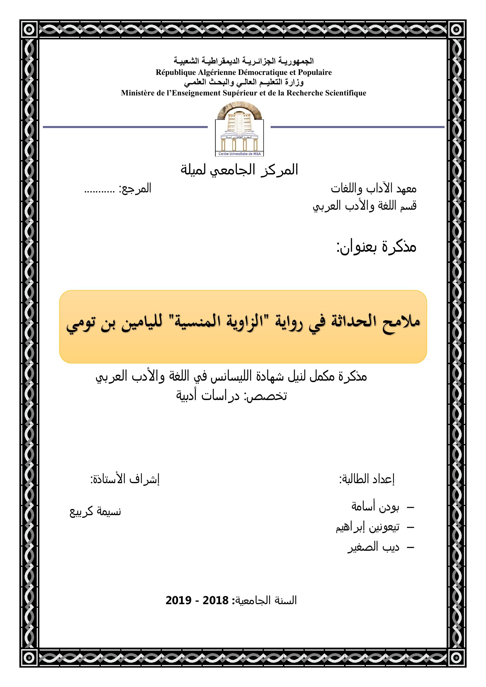 بودن أسامة & كريبع نسيمة (مشرفا) (2019). ملامح الحداثة في رواية " الزاوية المنسية" لليامين بن التومي.