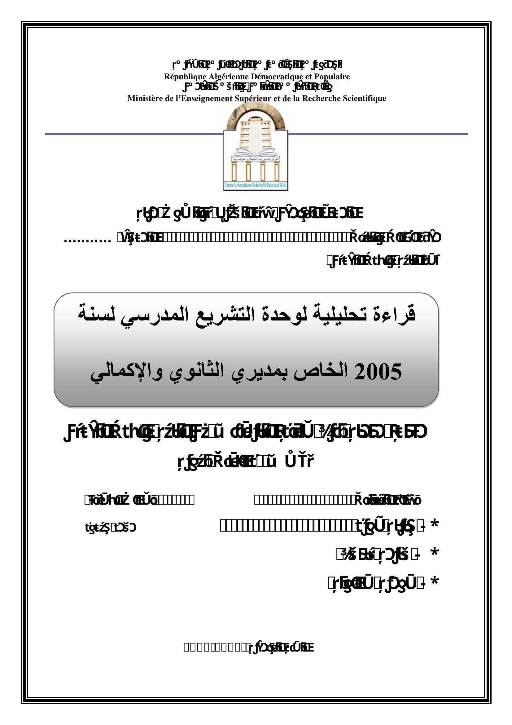 زويد جليلة & جغرود محمد (مشرفا) (2019). قراءة تحليلية لوحدة التشريع المدرسي لسنة2005 الخاص بمديري الثانوي والإكمالي.