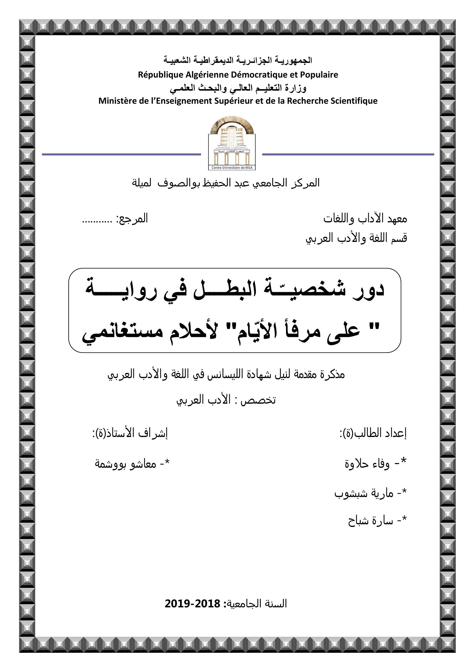 حلاوة وفاء & معاشو بوشمة (مشرفا) (2019). دور شخصية البطل في رواية "على مرفأ الايام" لاحلام مستغانمي.