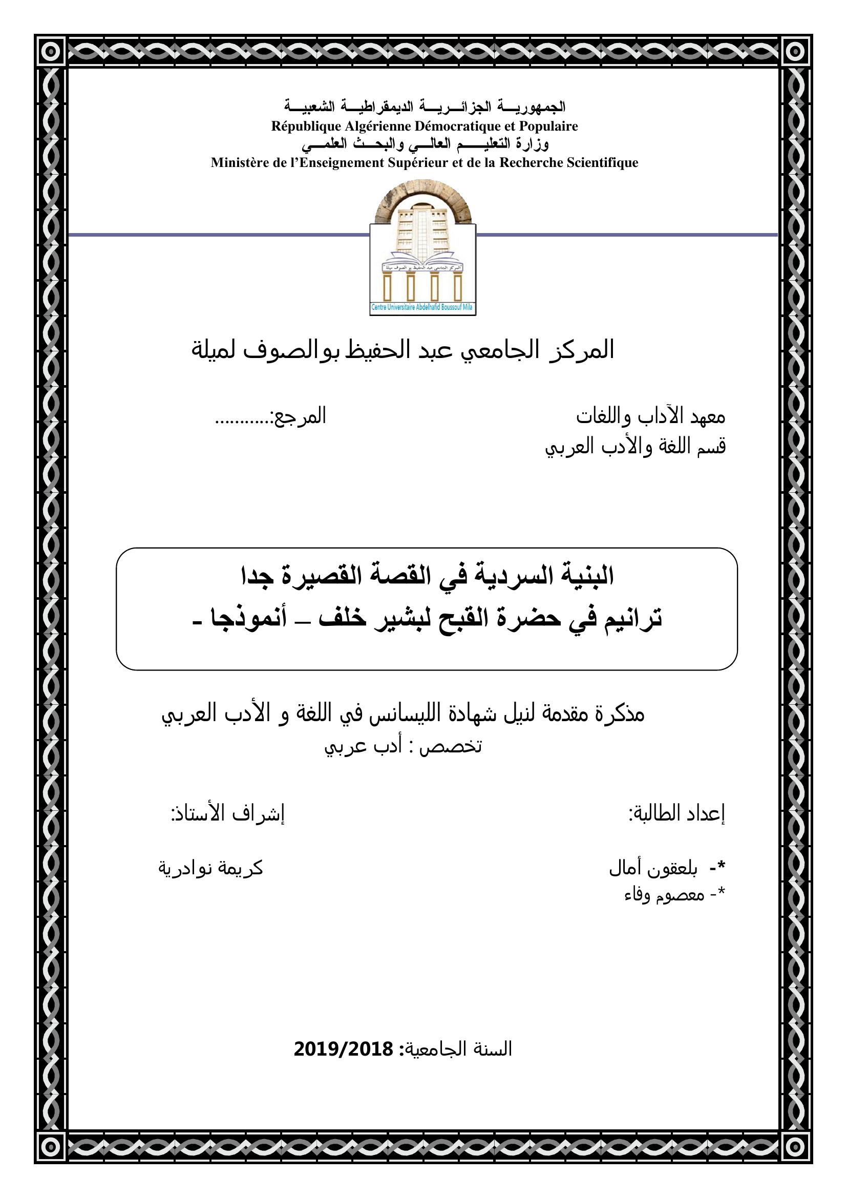 بلعقون أمال & نوادرية كريمة (مشرفا) (2019). البنية السردية في القصة القصيرة جدا" ترانيم في حضرة القبح لبشير خلف" انمودجا.