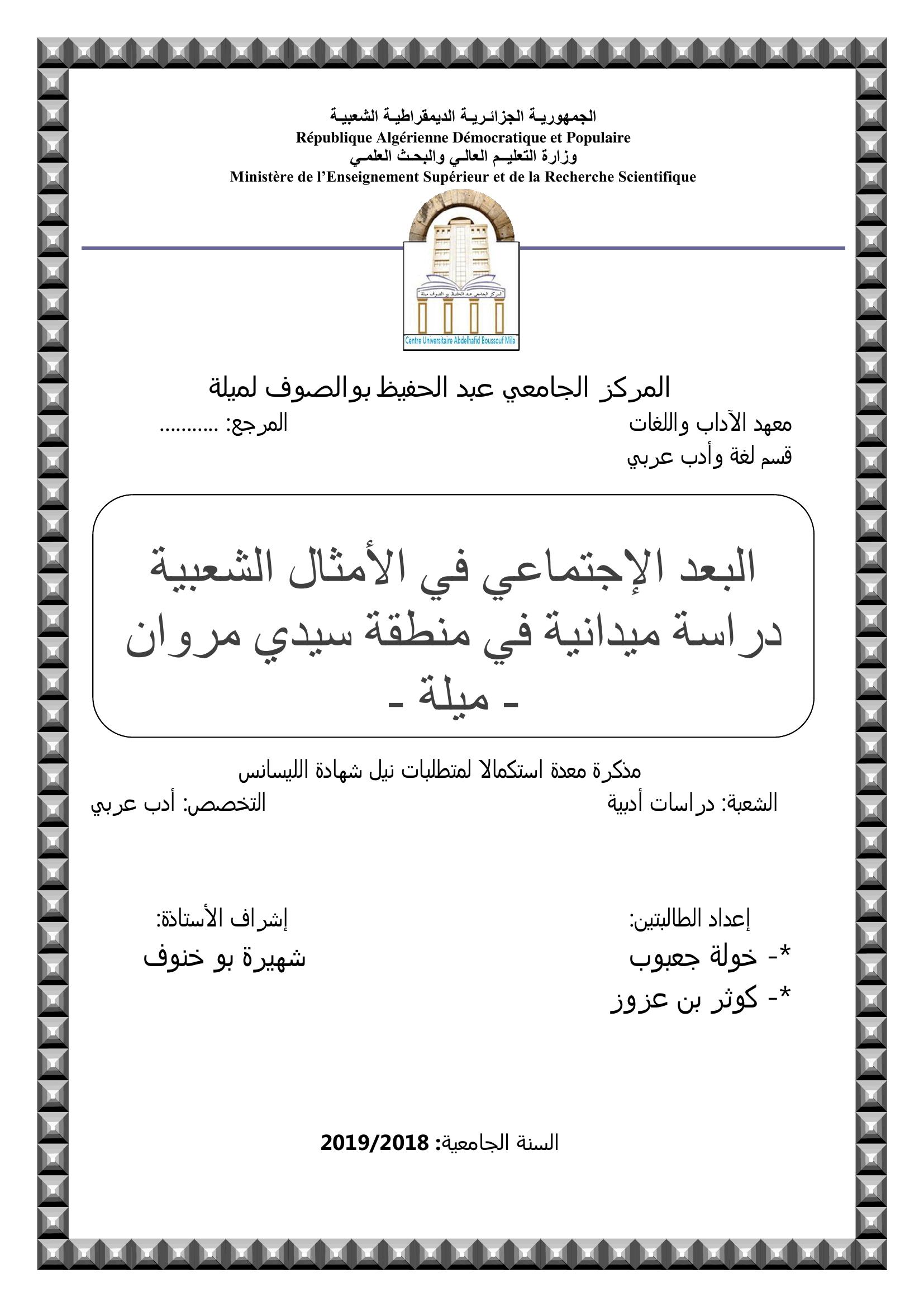 جعبوب خولة & بوخنوف شهيرة (مشرفا) (2019). البعد الإجتماعي في الأمثال الشعبية دراسة ميدانية في منطقة سيدي مروان-ميلة-.
