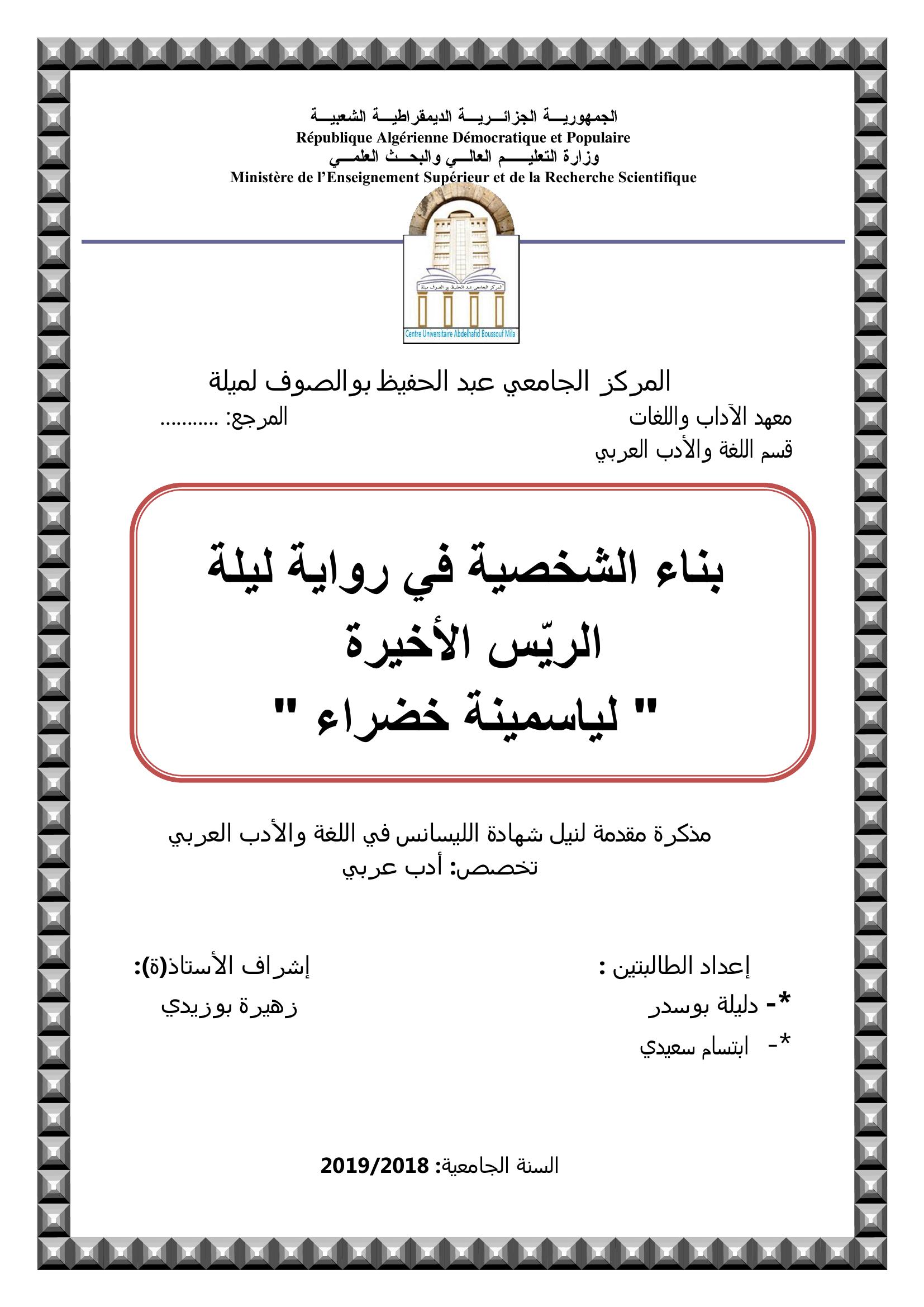 بوسدر دليلة & بوزيدي زهيرة (مشرفا) (2019). بناء الشخصية في رواية "ليلة الريس الأخيرة" لياسمينة خضرا.