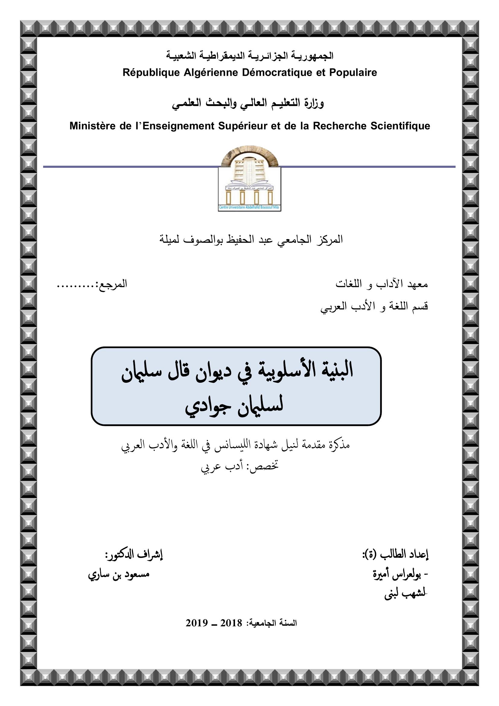 بولعراس أميرة & بن ساري مسعود(مشرفا) (2019). البنية الأسلوبية في قال سليمان لسليمان جوادي.