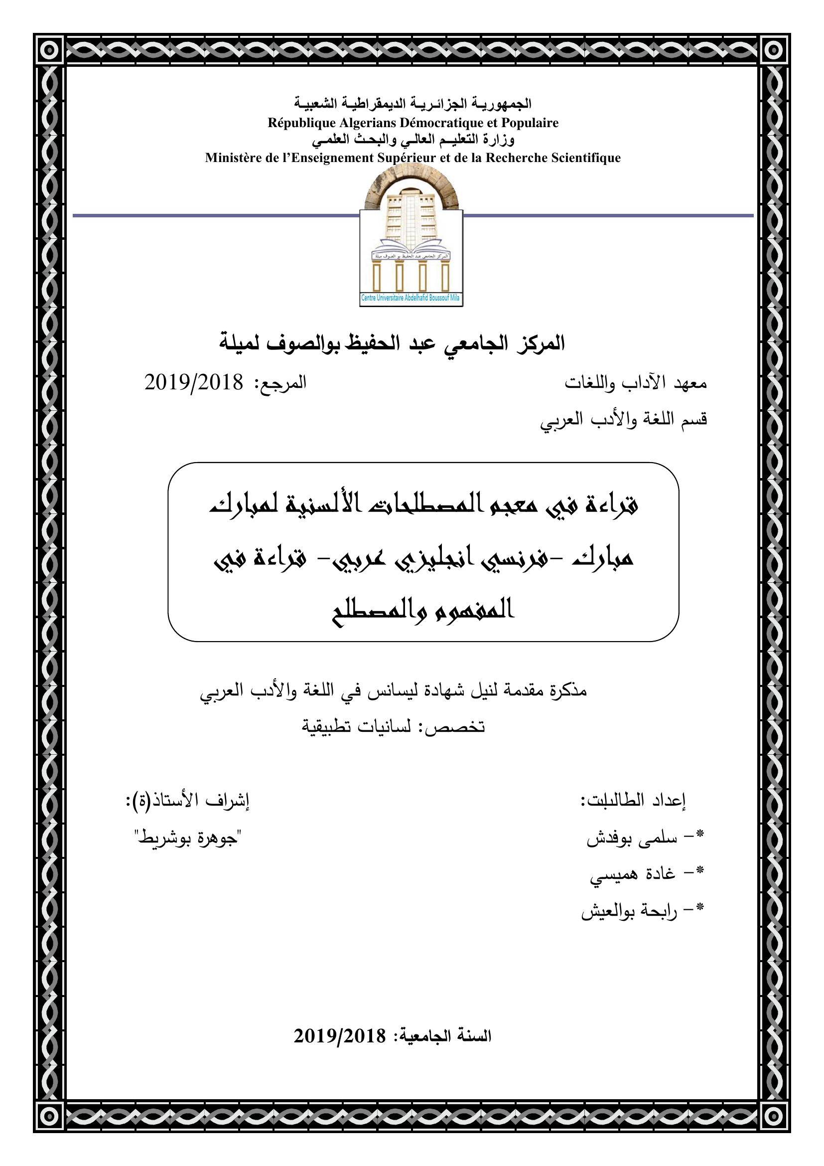 بوفدش سلمى & بوشريط جوهرة( مشرفا) (2019). قراءة في معجم المصطلحات ا لالسنية لمبارك مبارك - فرنسي -انجليزي - عربي- قراءة في المفهوم والمصطلح.