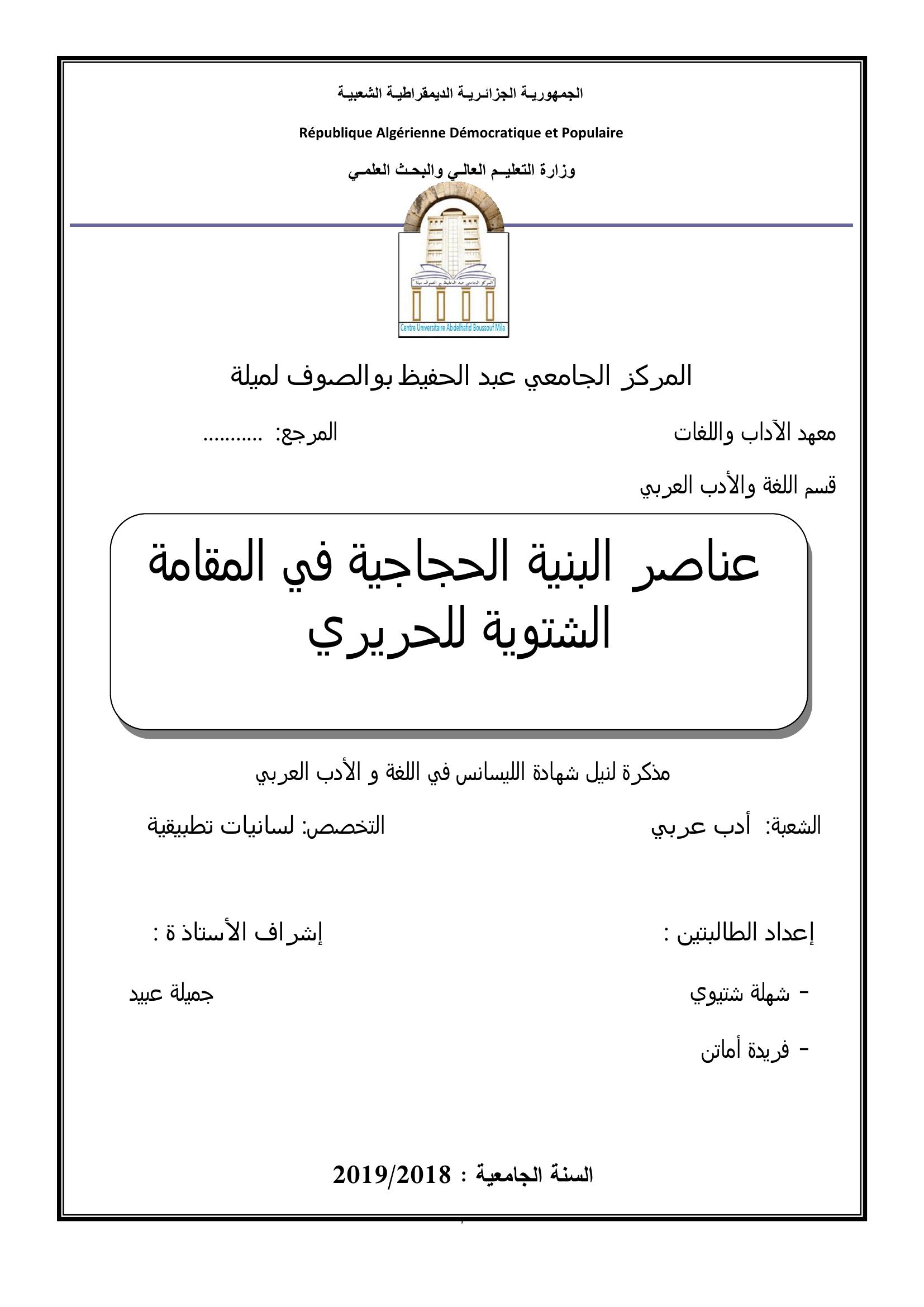 شتيوي شهلة & عبيد جميلة (مشرفا) (2019). عناصر البنية الحجاجية في المقامة الشتوية للحريري.