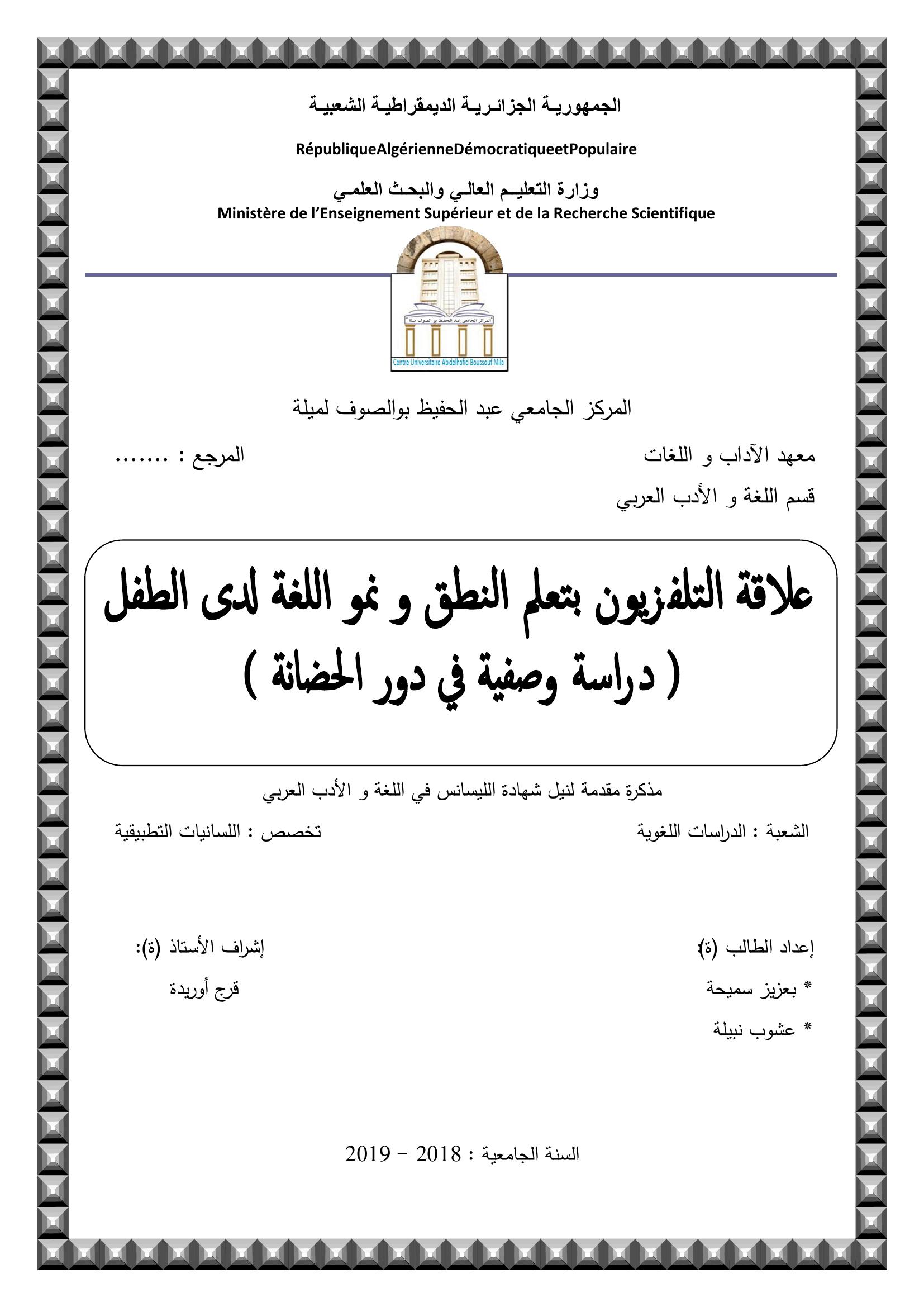 بعزيز سميحة & قرج أوريدة( مشرفا) (2019). علاقة التلفزيون بتعلم النطق ونمو اللغة لدى الطفل -دراسة وصفية في دور الحضانة-.