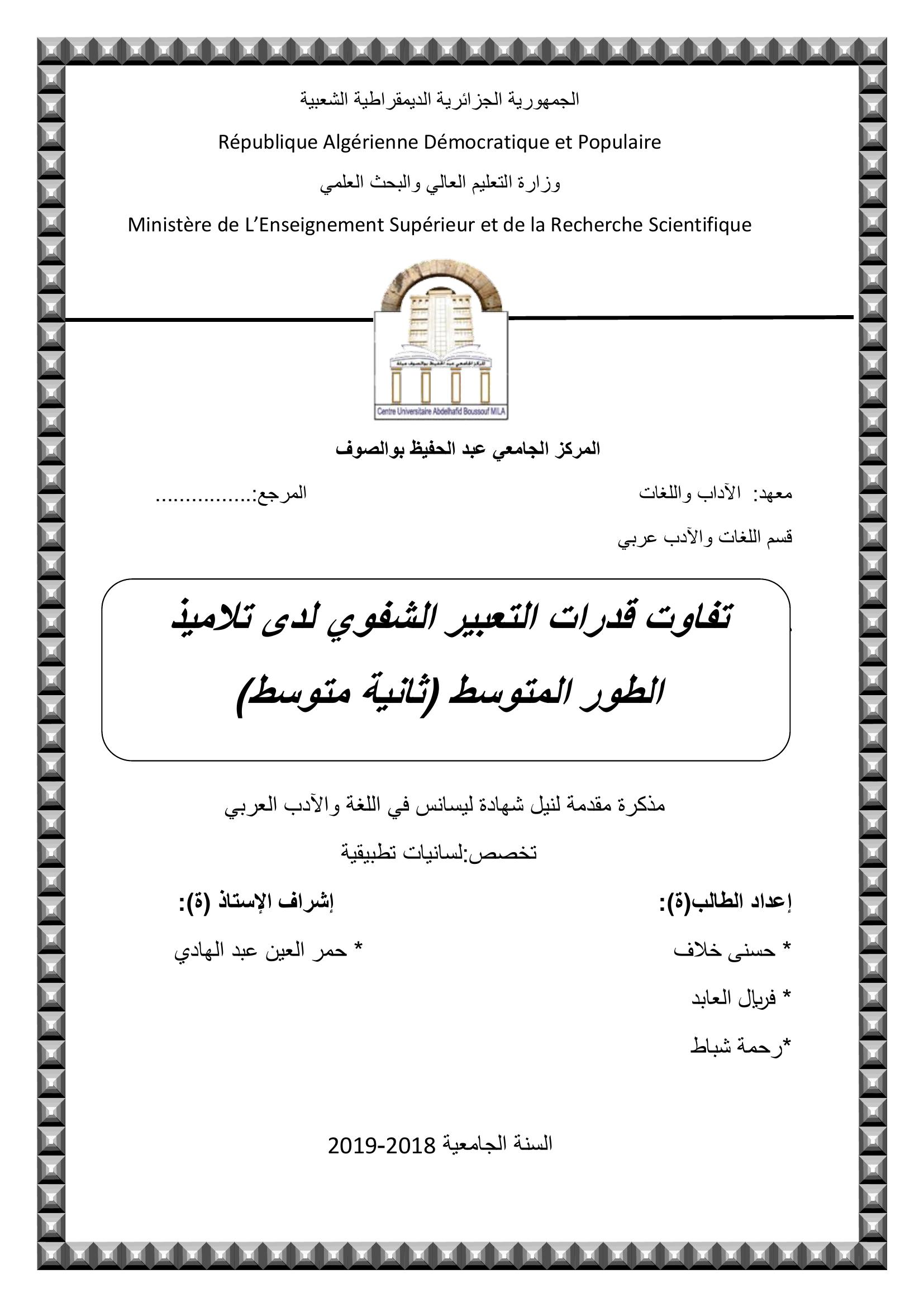 خلاف حسني & حمر العين عبد الهادي (مشرفا) (2019). تفاوت قدرات التعبير الشفوي لدى تلاميد الطور المتوسط- الثانية متوسط-.
