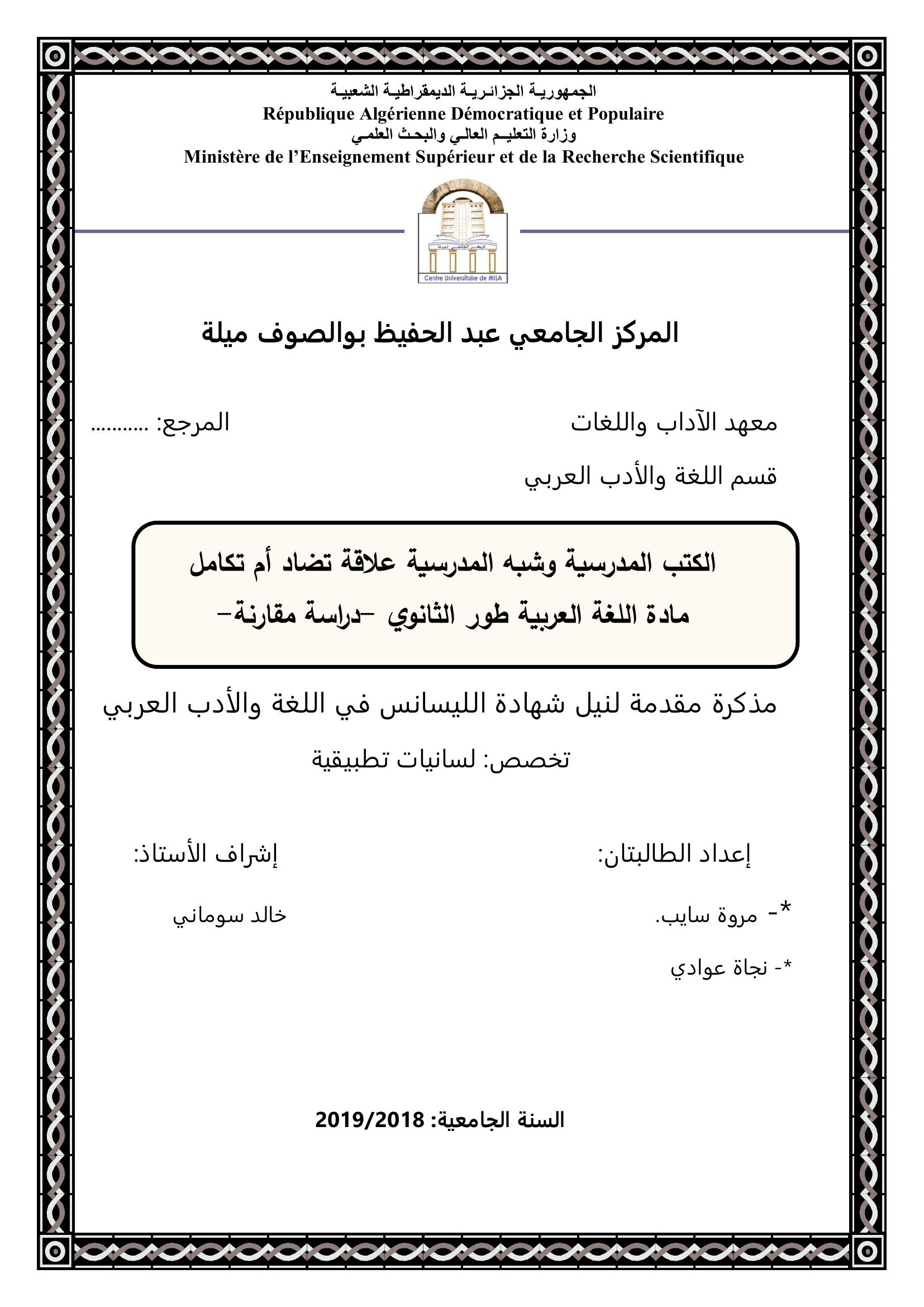 سايب مروة & سونامي خالد (مشرفا) (2019). الكتب المدرسية وشبه المدرسية علاقة تضادأم تكامل- مادة اللغة العربية الطور الثاني- دراسة مقارنة.