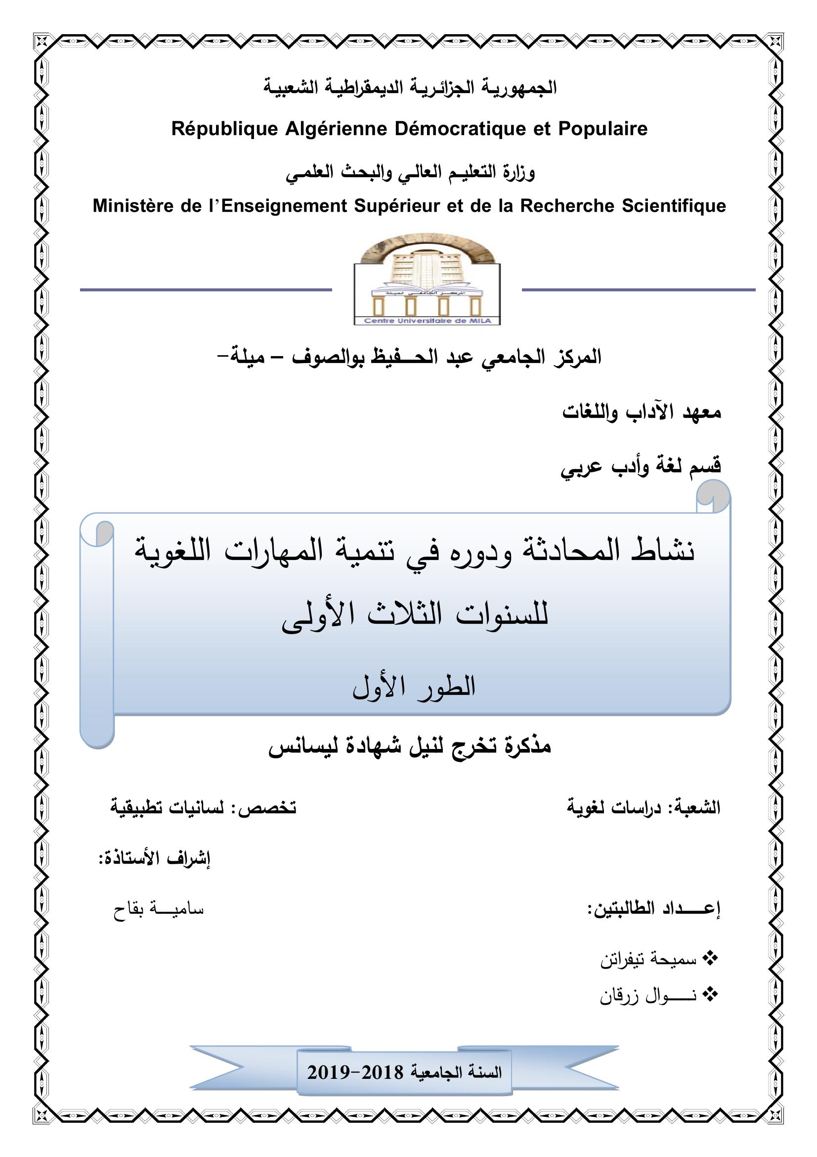 تيفراتن سميحة & بقاح سامية (مشرفا) (2019). نشاط المحادثة ودوره في تنمية المهارات اللغوية للسنوات الثلاثة الاولى في المرحلة الإبتدائية.
