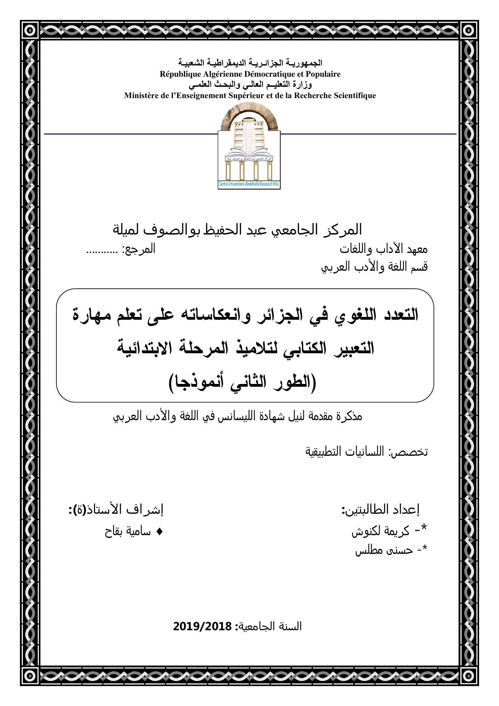 لكنوش كريمة & بقاح سامية (مشرفا) (2019). التعدد اللغوي في الجزائر وانعكاساته على تعلم مهارة التعبير الكتابي لتلاميذ المرحلة الابتدائية -الطور الثاني انمودجا.