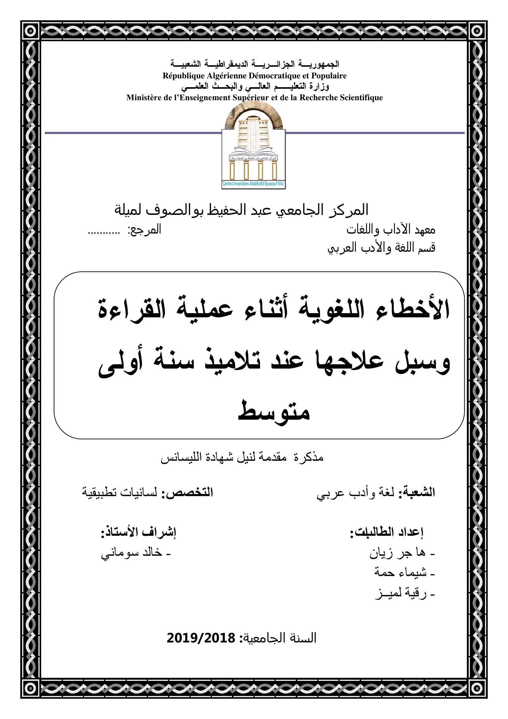 زيان هاجر & سونامي خالد (مشرفا) (2019). الأخطاء اللغوية أثناء عملية القراءة وسبل علاجها عند تلاميذ سنة أولى متوسط.