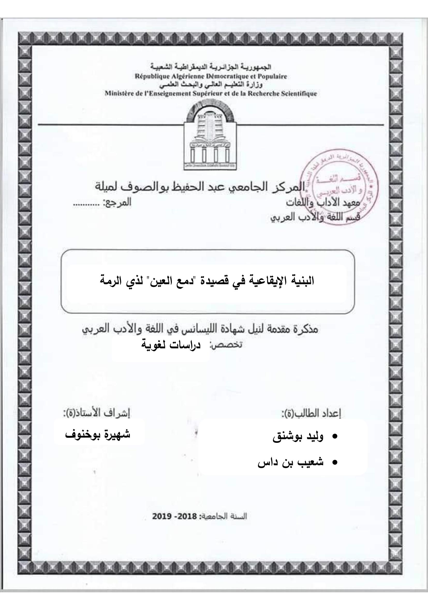 بوشنق وليد & بوخنوف شهيرة (مشرفا) (2019). البنية الايقاعية في قصيدة "دمع العين" لذي الرمة.