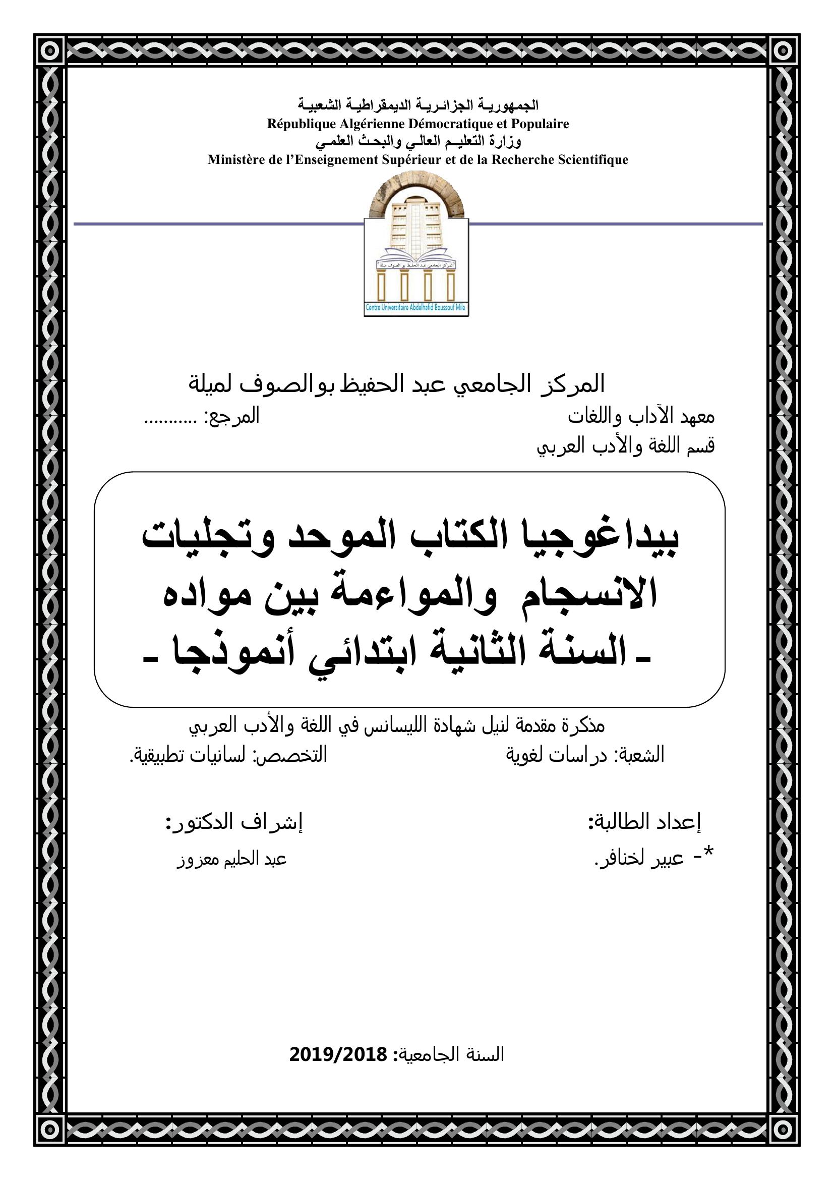 لخنافر عبير & معزوز عبد الحليم (مشرفا) (2019). بيداغوجيا الكتاب الموحد وتجليات الانسجام والموائمة بين مواده -السنة الثانية إبتدائي انمودجا.
