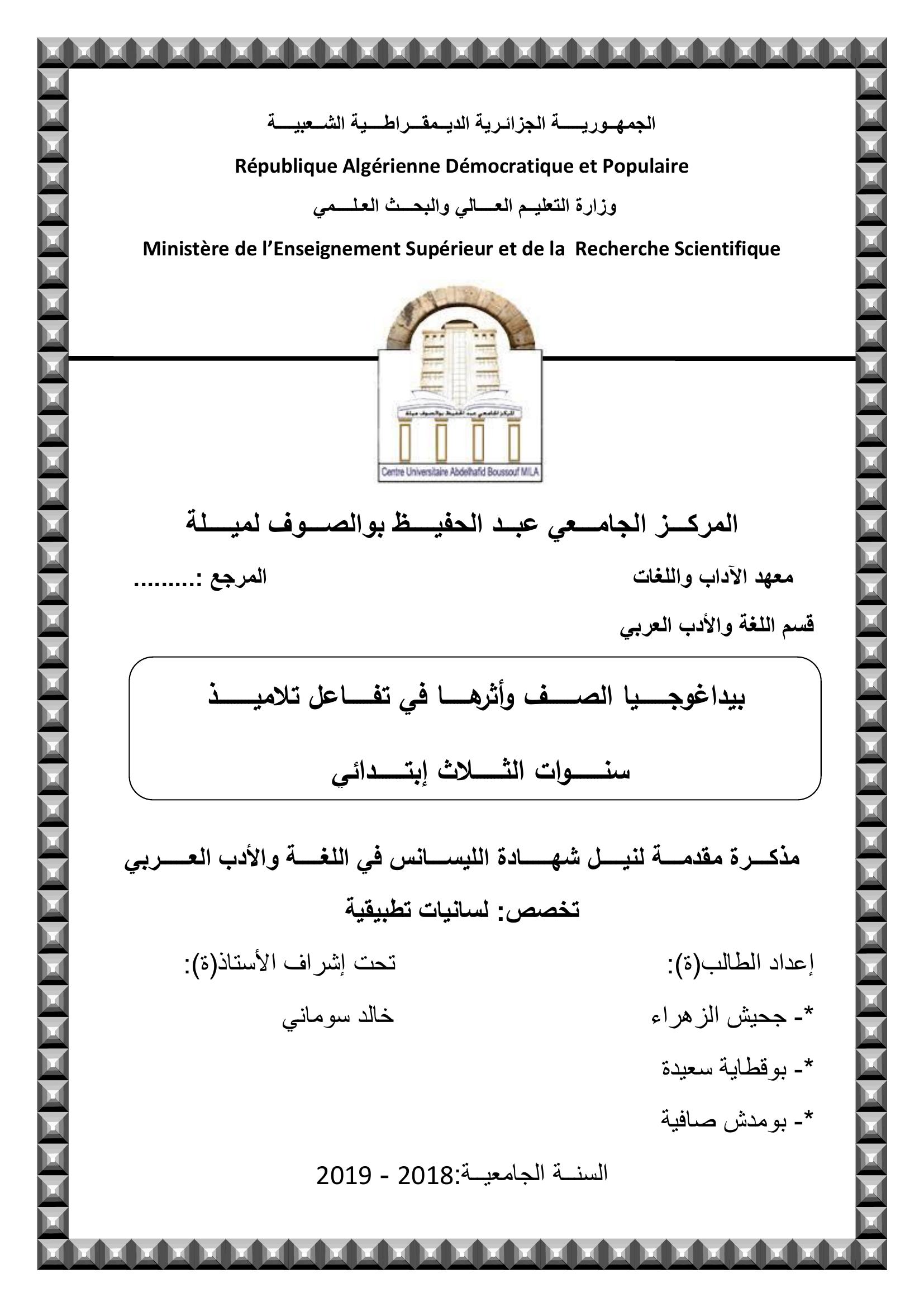 جحيش الزهراء & سونامي خالد (مشرفا) (2019). بيداغوجيا الصف وأثرها في تفاعل تلاميذ سنوات الثلاث إبتدائي.
