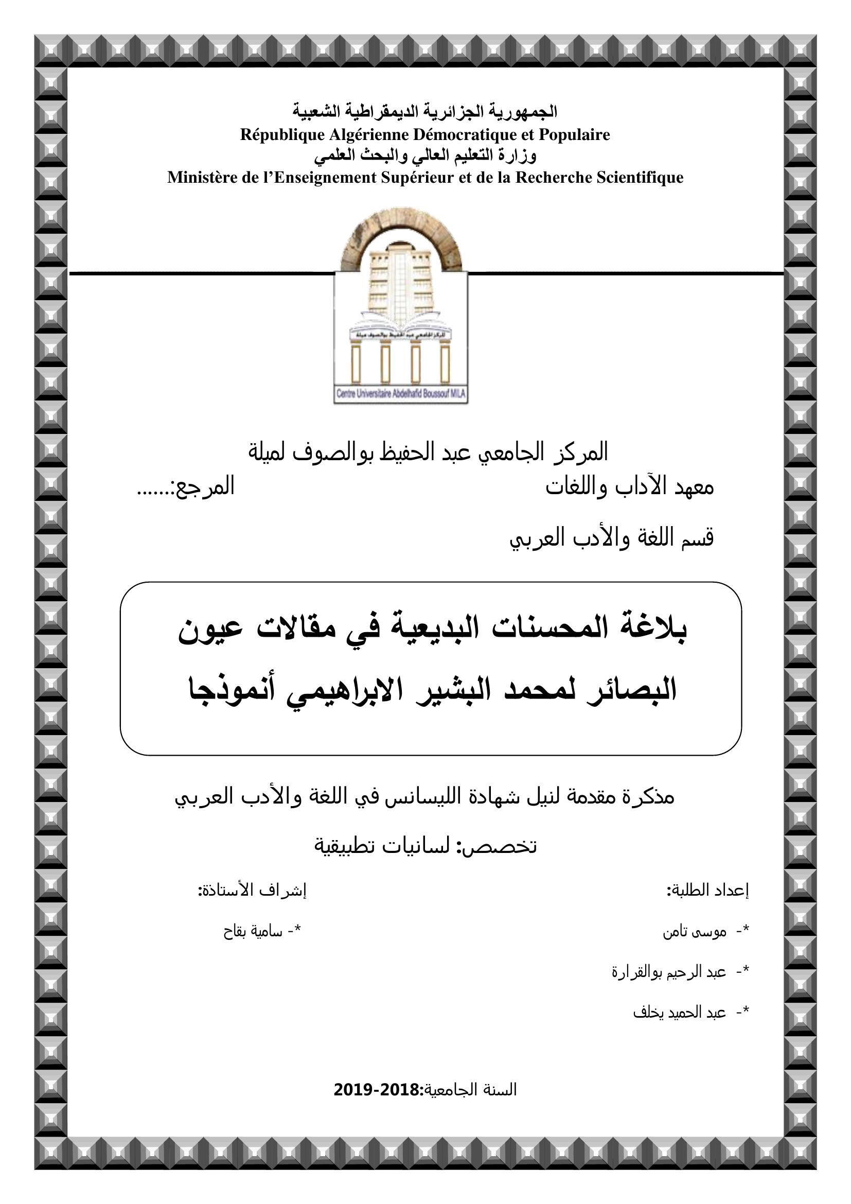 تامن موسى & بقاح سامية (مشرفا) (2019). بلاغة المحسنات البديعية في مقالات عيون البصائر لمحمد البشير الابراهيمي انمودجا.