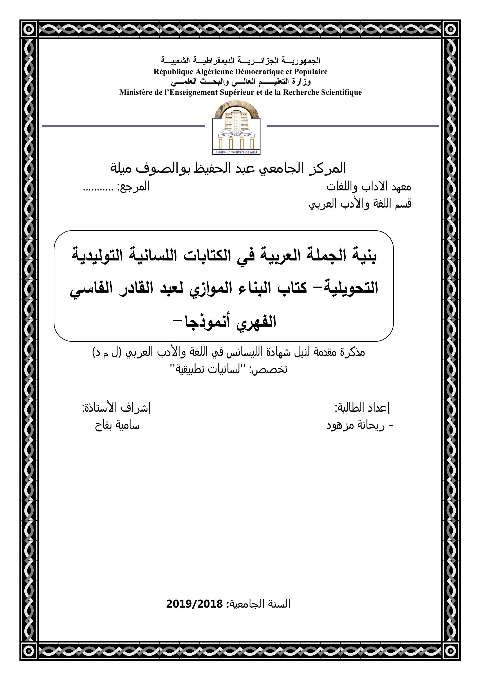 مزهود ريحانة & بقاح سامية (مشرفا) (2019). بنية الجملة العربية في الكتابات اللسانية التوليدية التحويلية - كتاب البناء الموازي لعبد القادر الفاسي الفهري انمودجا.