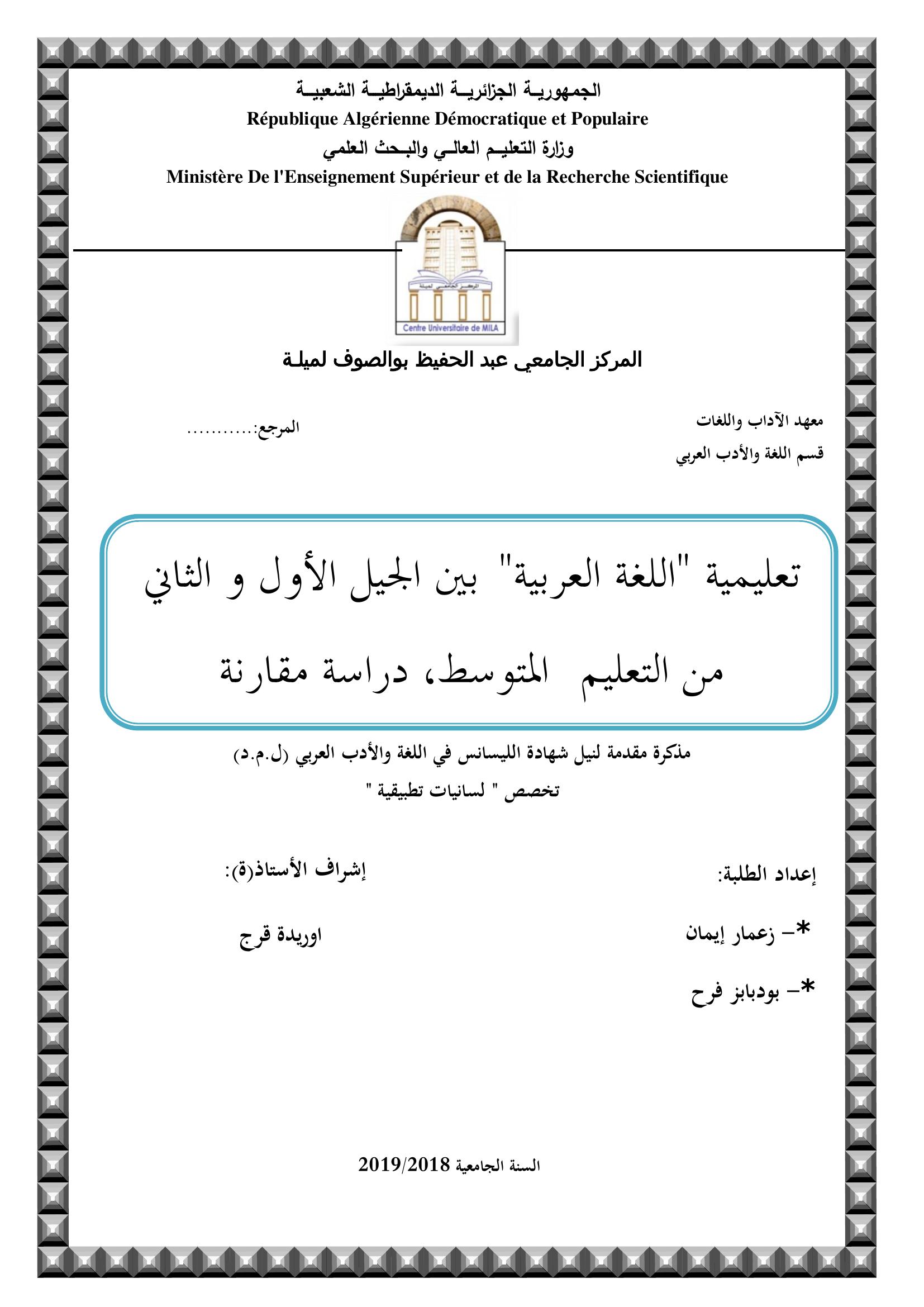 زغمار إيمان & قرج أوريدة( مشرفا) (2019). تعليمية اللغة العربية "بين الجيل الاول والثاني من التعليم المتوسط" دراسة مقارنة.