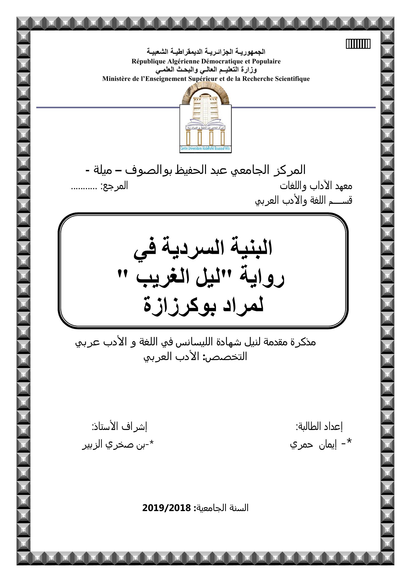 حمري إيمان & بن صخري الزبير( مشرفا) (2019). البنية السردية في رواية الليل الغريب لمراد بوكرزازة.