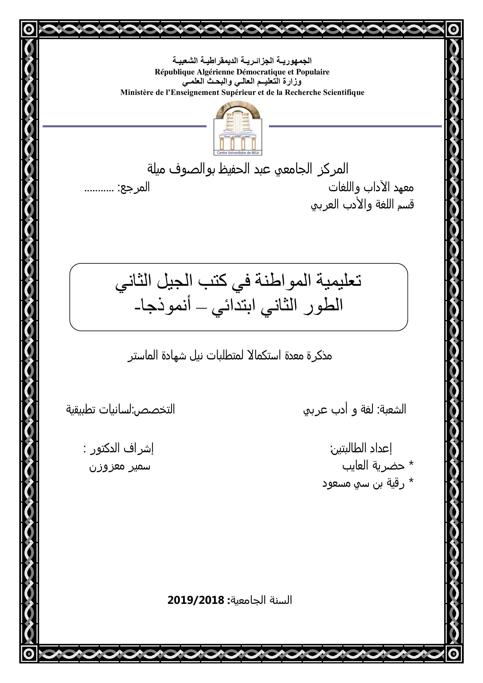 العايب حضرية & معزوزن سمير (مشرفا) (2019). تعليمية المواطنة في كتب الجيل الثاني الطور الثاني ابتدائي انمودجا.