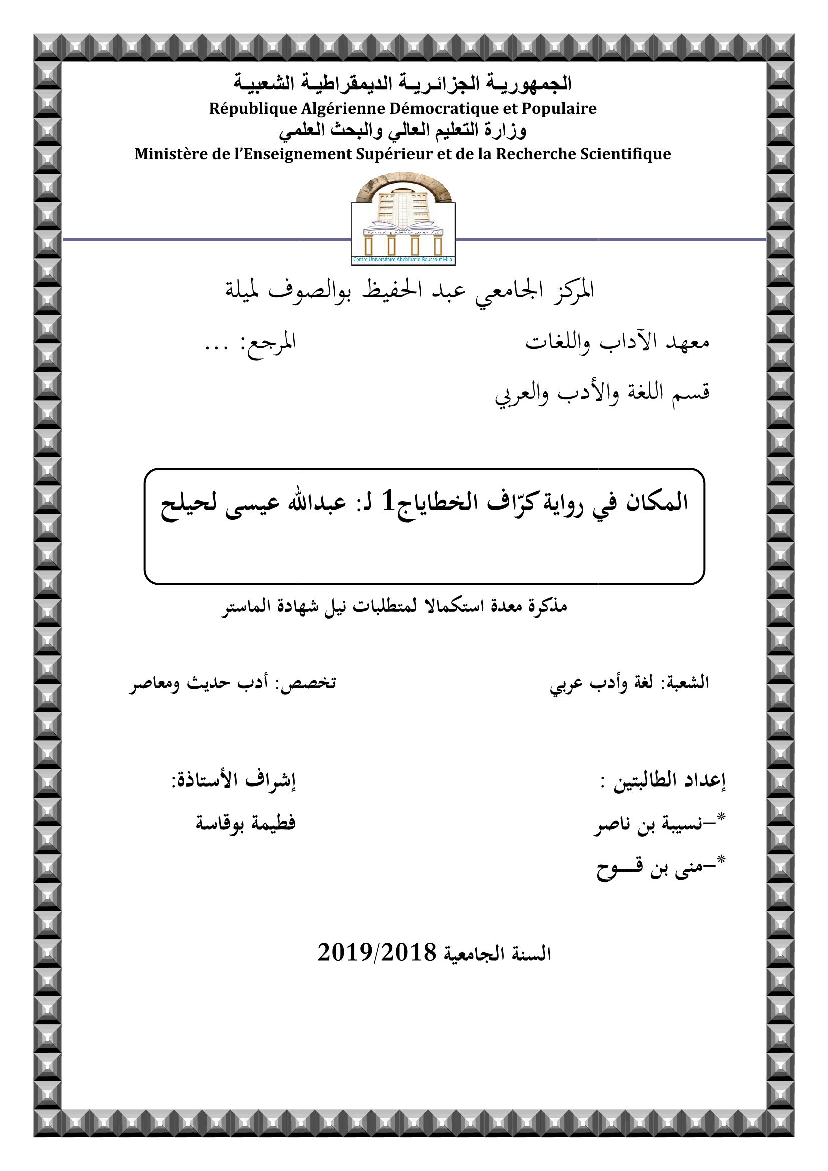 بن ناصر نسيبة & بوقاسة فطيمة ( مشرفا) (2019). المكان في رواية"كراف الخطايا ج1" عبد الله عيسى لحيلح.