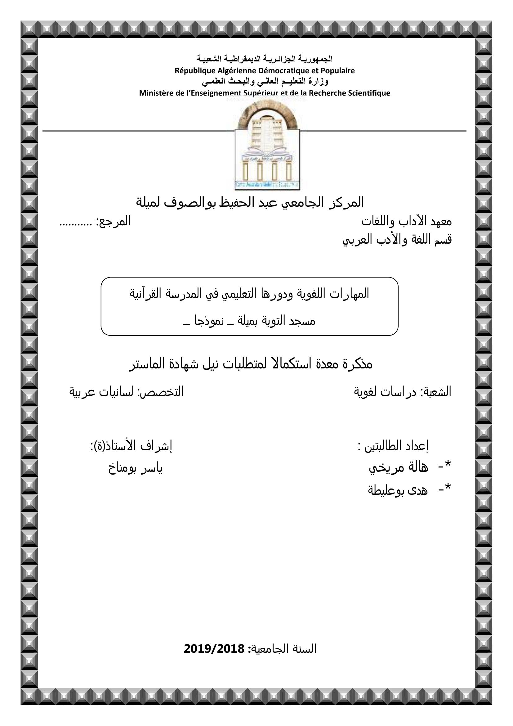 مريخي هالة & بومناخ ياسر (مشرفا) (2019). المهارات اللغوية ودورها التعليمي في المدرسة القرانية -مسجد التوبة بميلة نمودجا-.