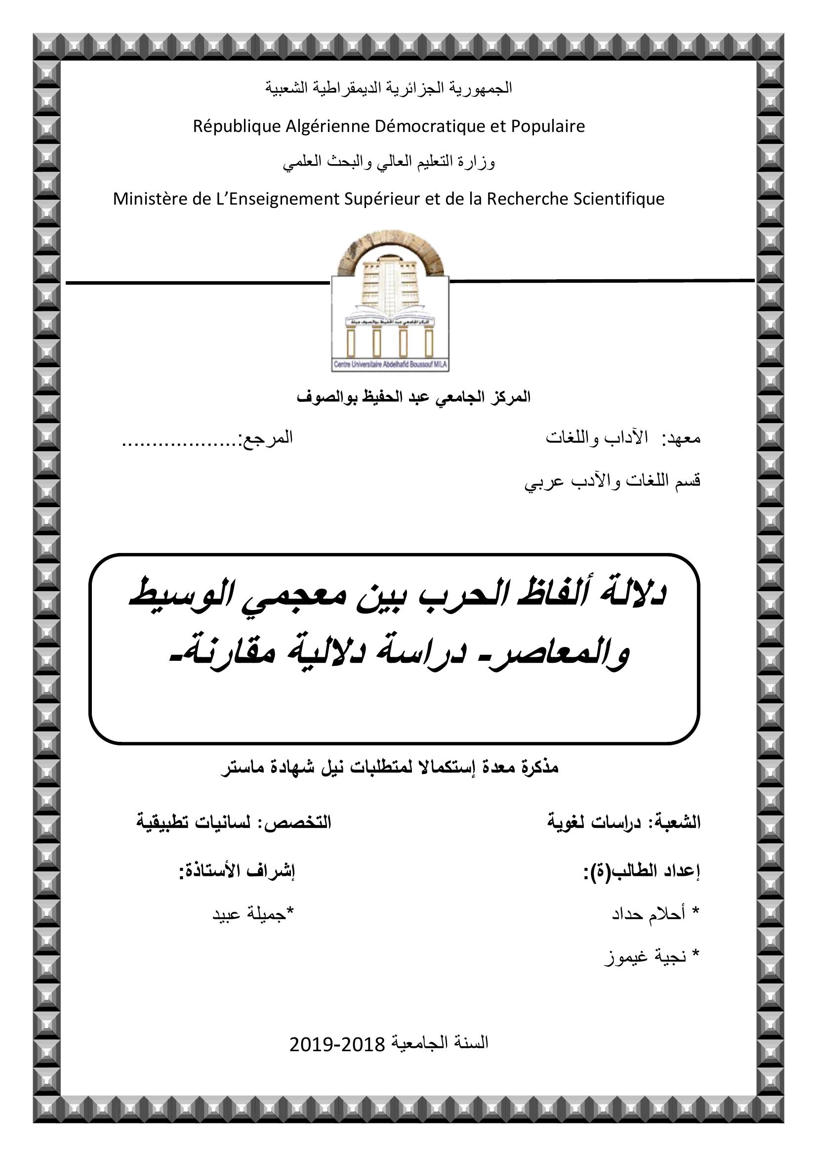 حداد أحلام & عبيد جميلة (مشرفا) (2019). دلالة ألفاظ الحرب بين معجمي الوسيط والمعاصر -دراسة دلالية مقارنة.