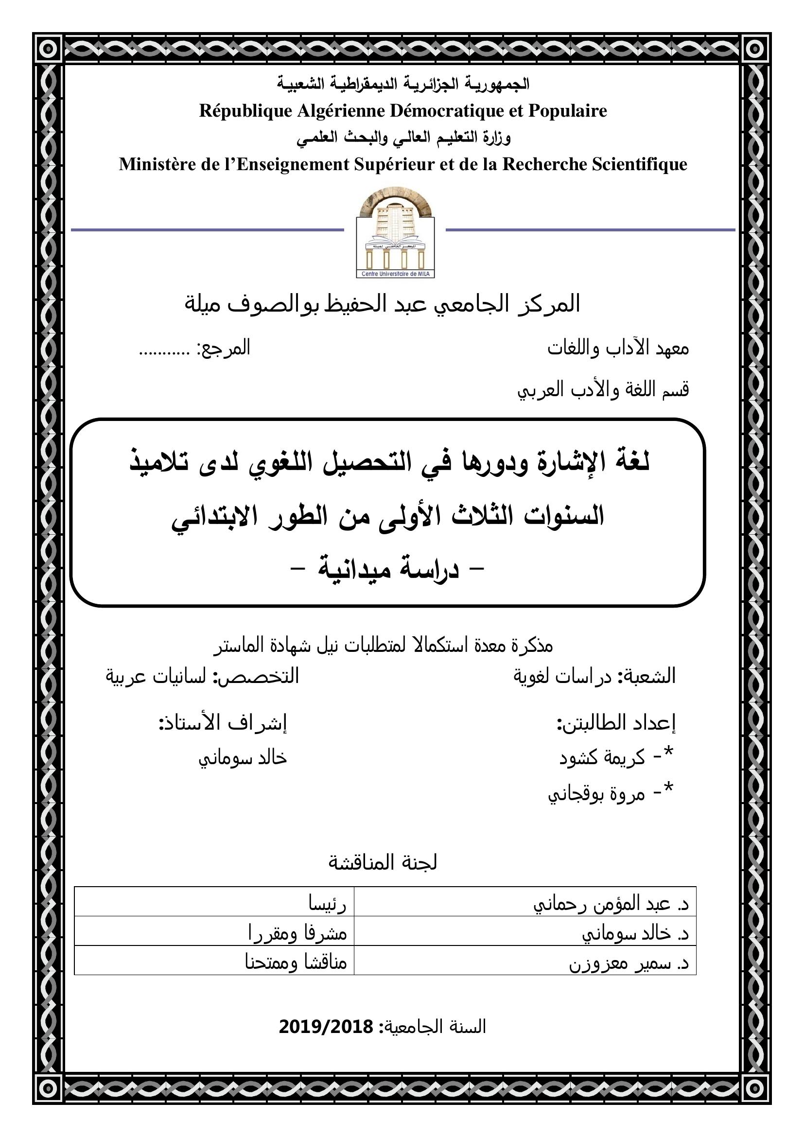 كشود كريمة & سونامي خالد (مشرفا) (2019). لغة الاشارة ودورها في التحصيل اللغوي لدى تلاميذ السنوات الثلاث الاولى من الطور الابتدائي -دراسة ميدانية-.