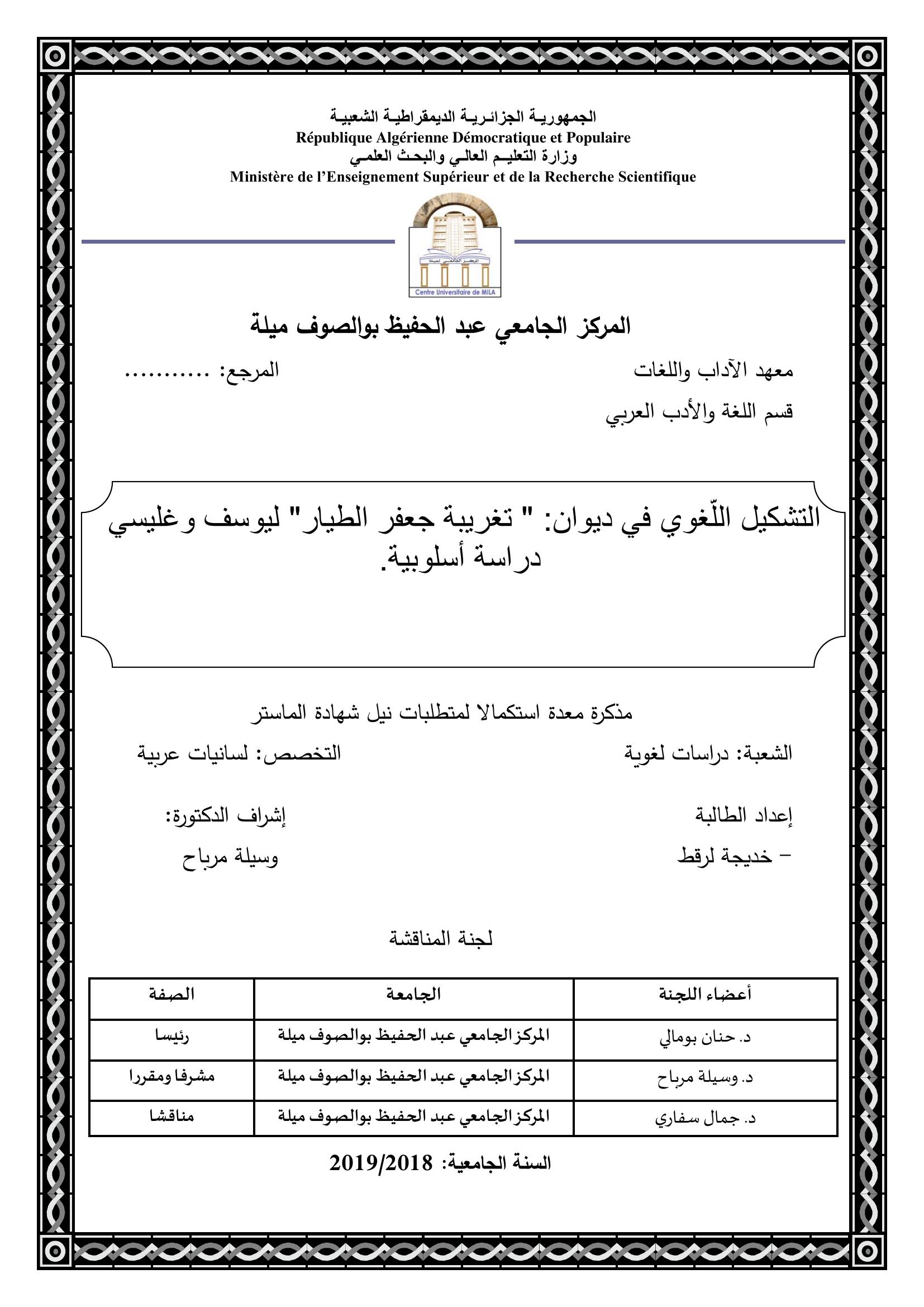 لرقط خديجة & مرباح وسيلة (مشرفا) (2019). التشكيل اللغوي في ديوان " تغريبة جعفر الطيار " ليوسف وغليسي دراسة اسلوبية.