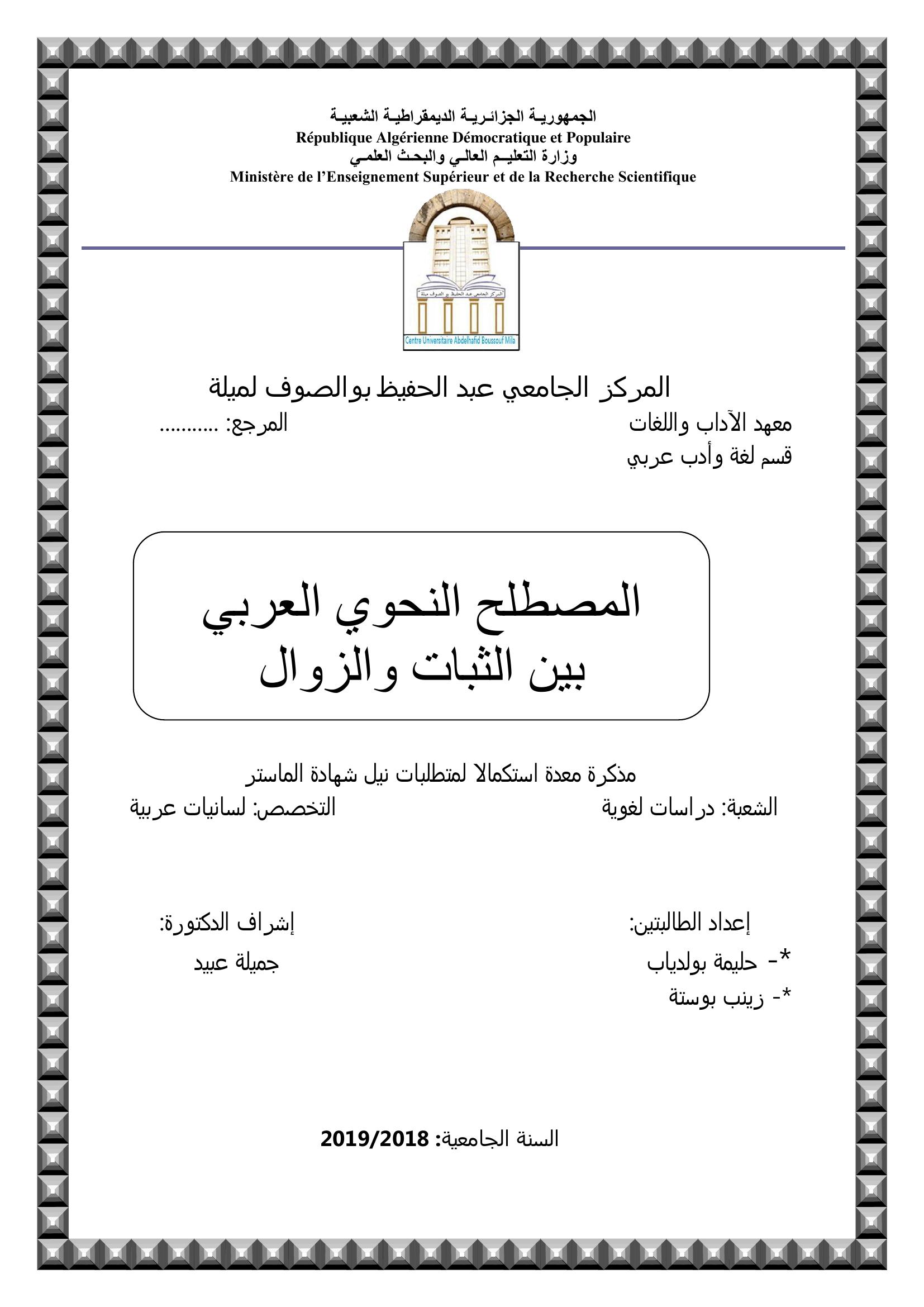 بولدياب حليمة & عبيد جميلة (مشرفا) (2019). المصطلح النحوي العربي بين الثبات والزوال.