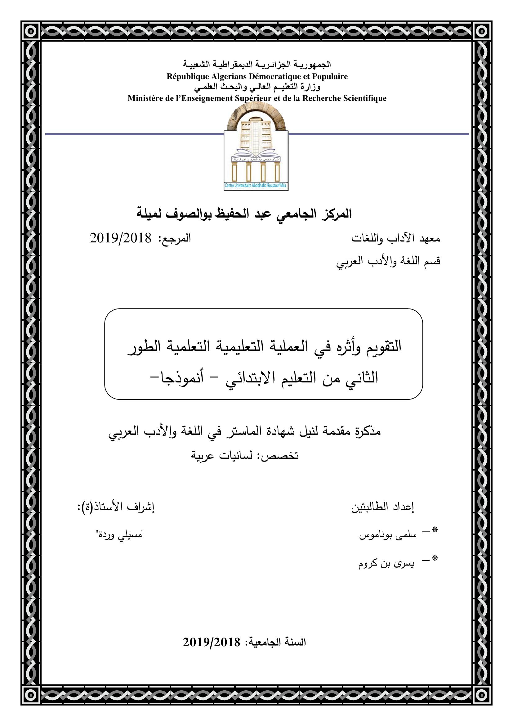 بوناموس سلمى (2019). التقويم وأثره في العملية التعليمية الطور الثاني منالتعليم الابتدائي -انمودجا.