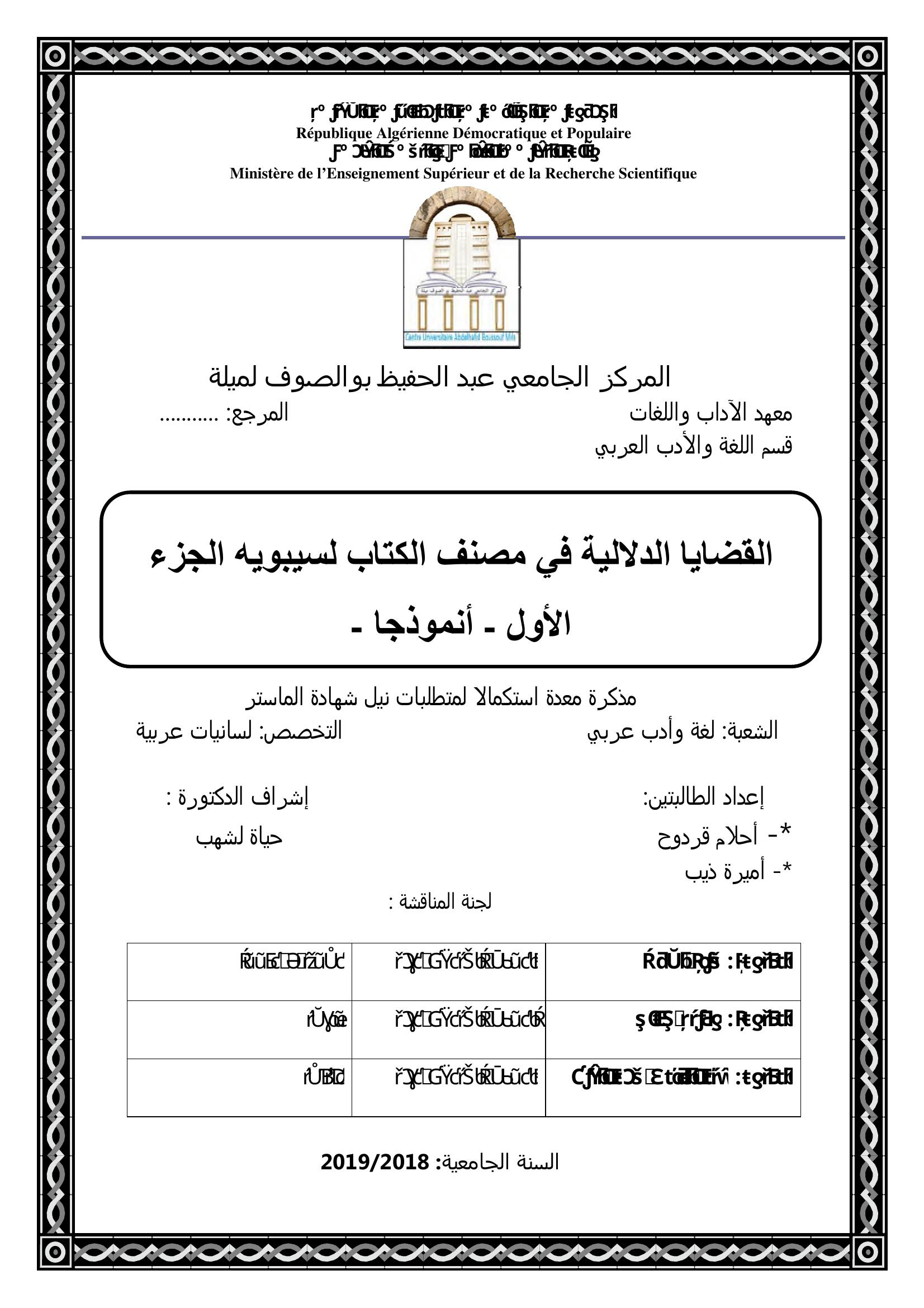 قردوح أحلام & لشهب حياة (مشرفا) (2019). القضايا الدلالية في مصنف الكتاب لسيبويه الجزء الاول -انمودجا-.