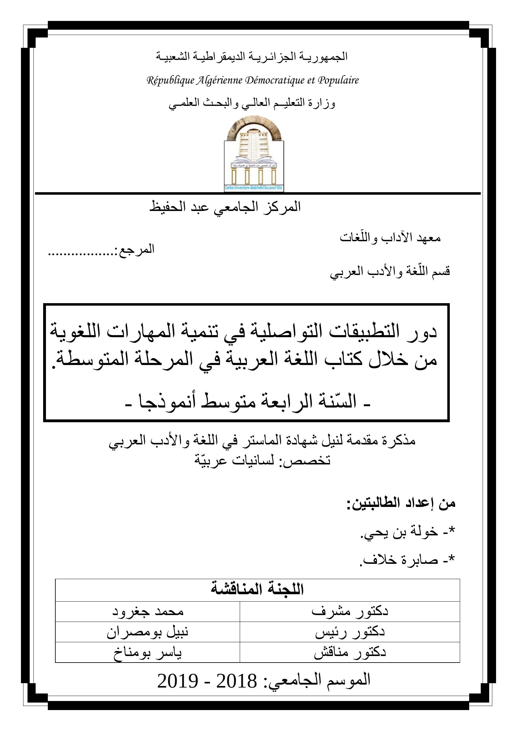 بن يحي خولة & جغرود محمد (مشرفا) (2019). دور التطبيقات التواصلية في تنمية المهارات اللغوية من خلال كتاب اللغة العربية في المرحلة المتوسطة - السنة الرابعة متوسط انمودجا.