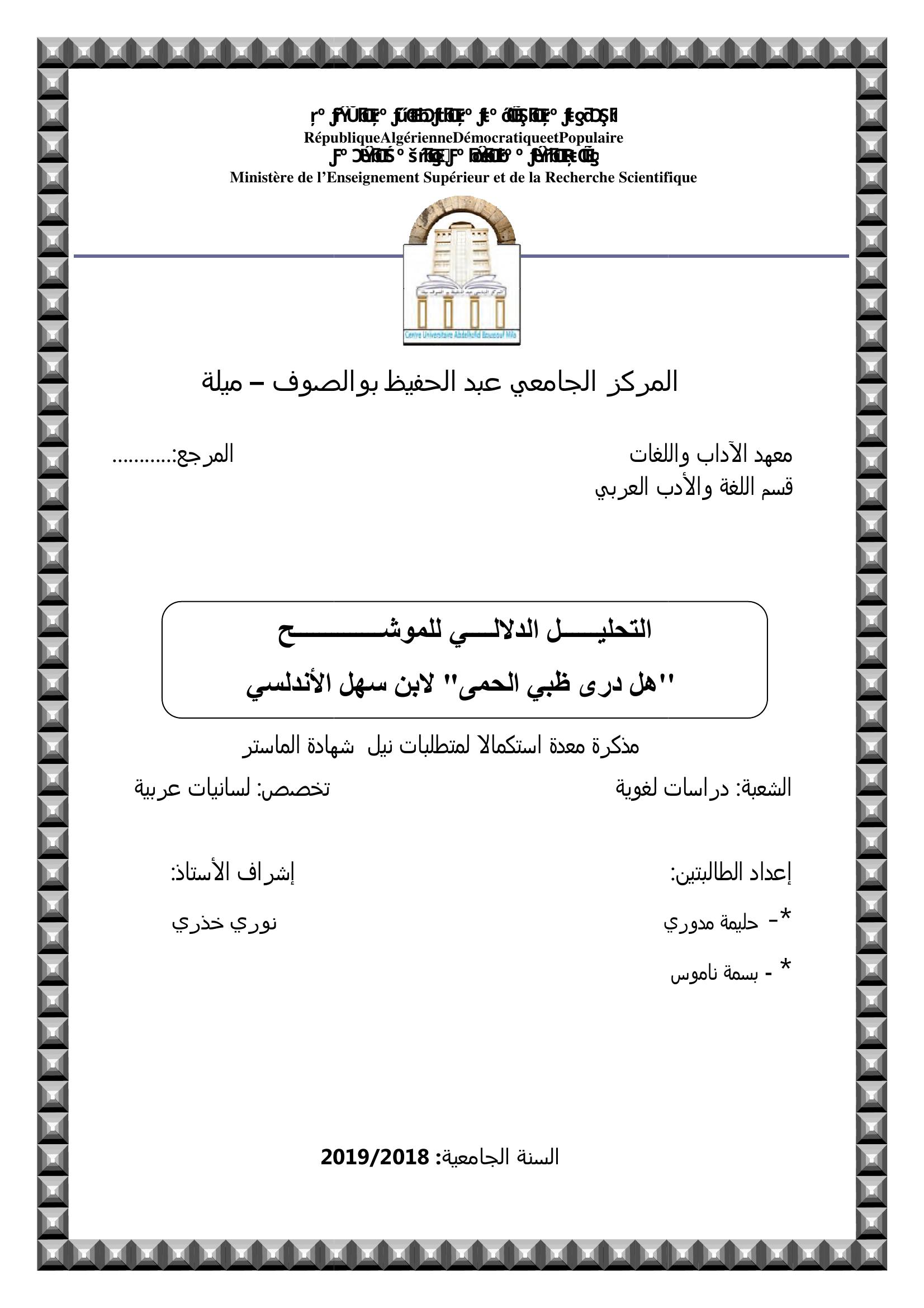 مدوري حليمة & نوري خدري(مشرفا) (2019). التحليل الدلالي للموشح" هل درى ضبي الحمى " لإبن سهيل الاندلسي.