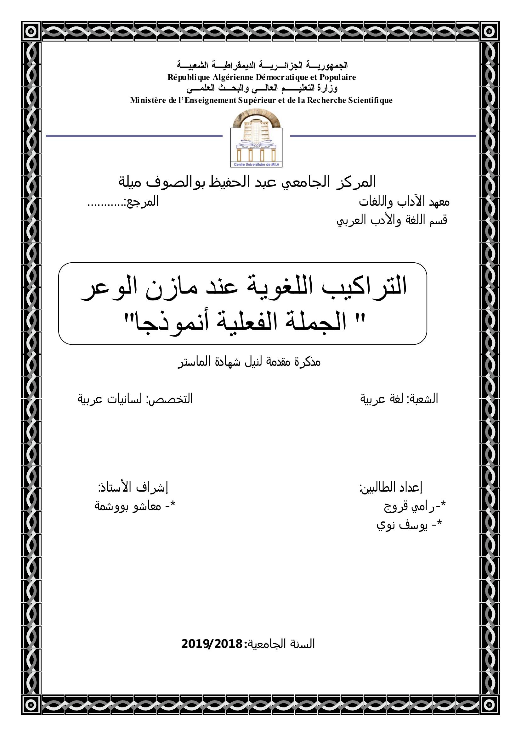قروج رامي & معاشو بوشمة (مشرفا) (2019). التراكيب اللغوية عند مازن الوعد الجملة الفعلية انمودجا.