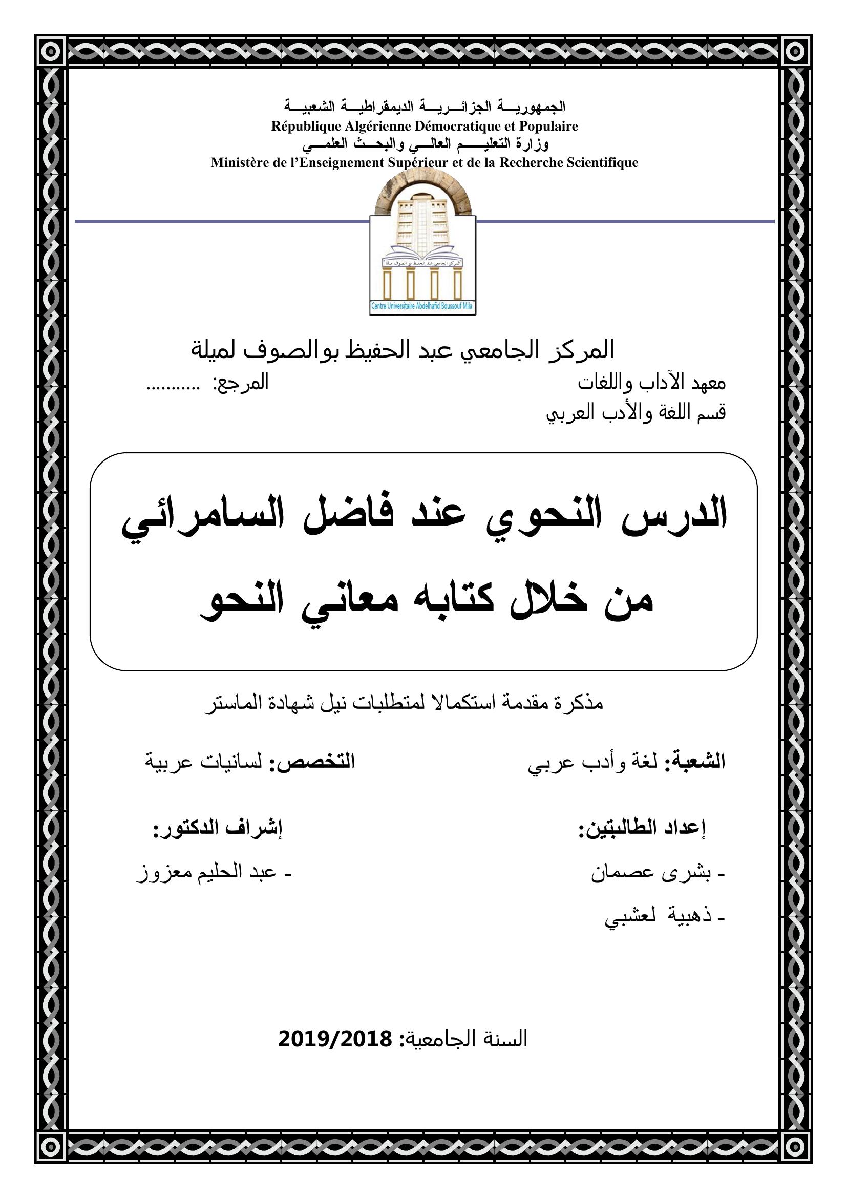 عصمان بشرى & معزوز عبد الحليم (مشرفا) (2019). الدرس النحوي عند فاضل السامرائي من خلال كتابه معاني النحو.