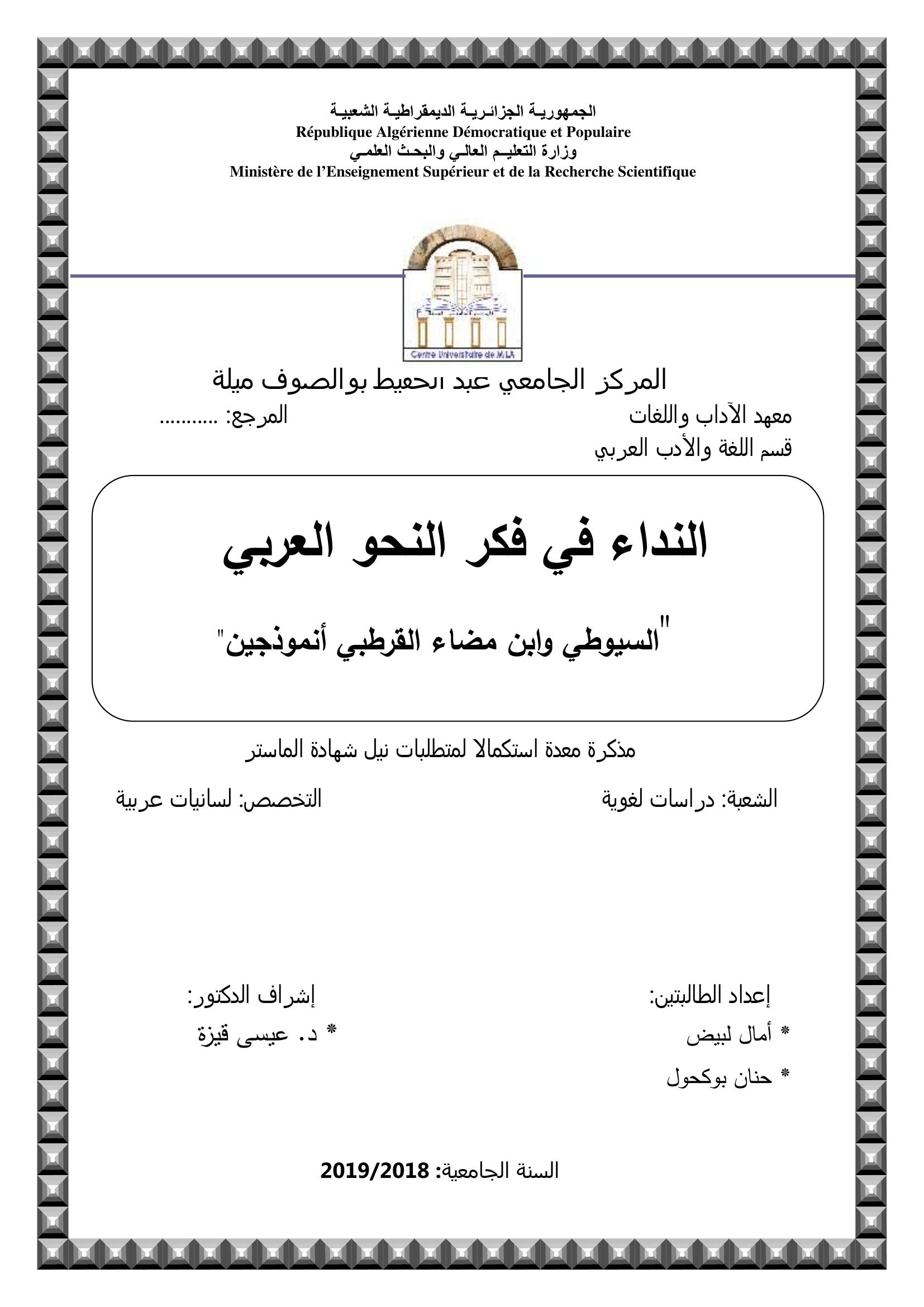 لبيض آمال & قيزة عيسى ( مشرفا) (2019). النداء في فكر النحو العربي " السيوطي وابن مضاء القرطبي "انمودجين.